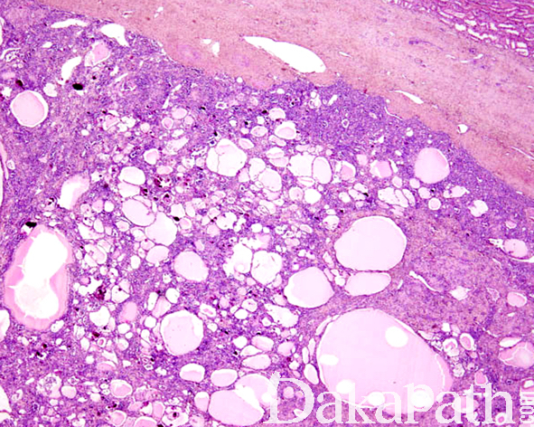 滤泡腔内和腔隙壁内常见多少不等的钙化物质沉积,分为两种类型:第一种类似于砂粒体样钙化,第二种为蓝染无定形的钙化物质;偶尔,某些滤泡壁内可见局灶的小的毛细血管样凸起,类似于萎缩的肾小球,PAS 染色凸起结构内的基底膜物质;罕见的情况下,可见肾小球囊性变的结构特征:Bowman 囊明显的囊性扩增,其内可见残存的不成熟的肾小球凸起,表面被覆扁平的内皮细胞;
