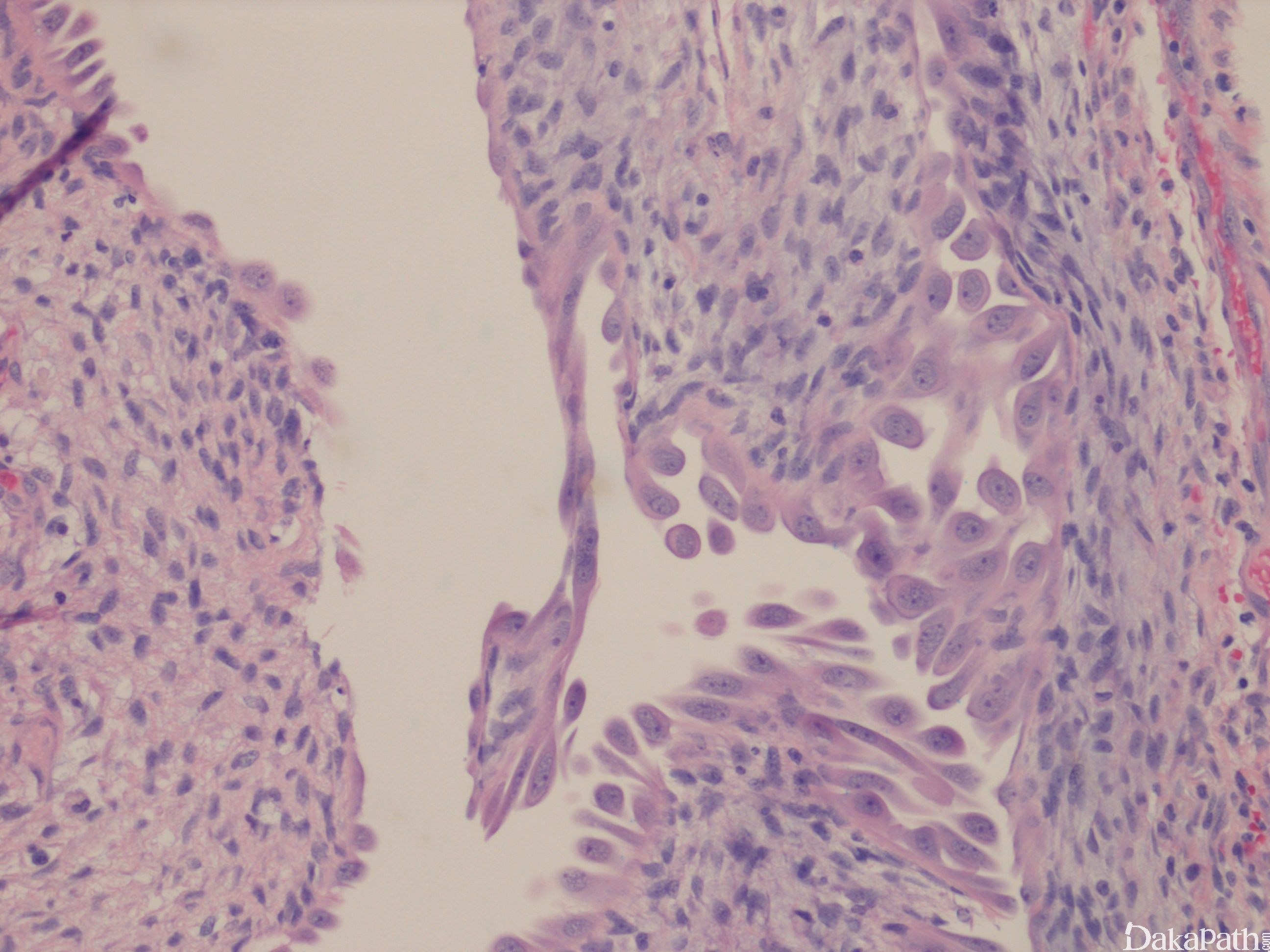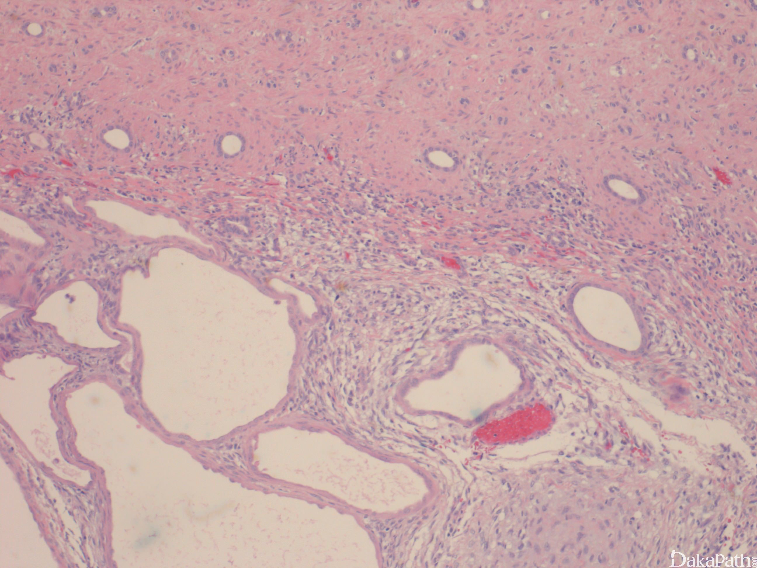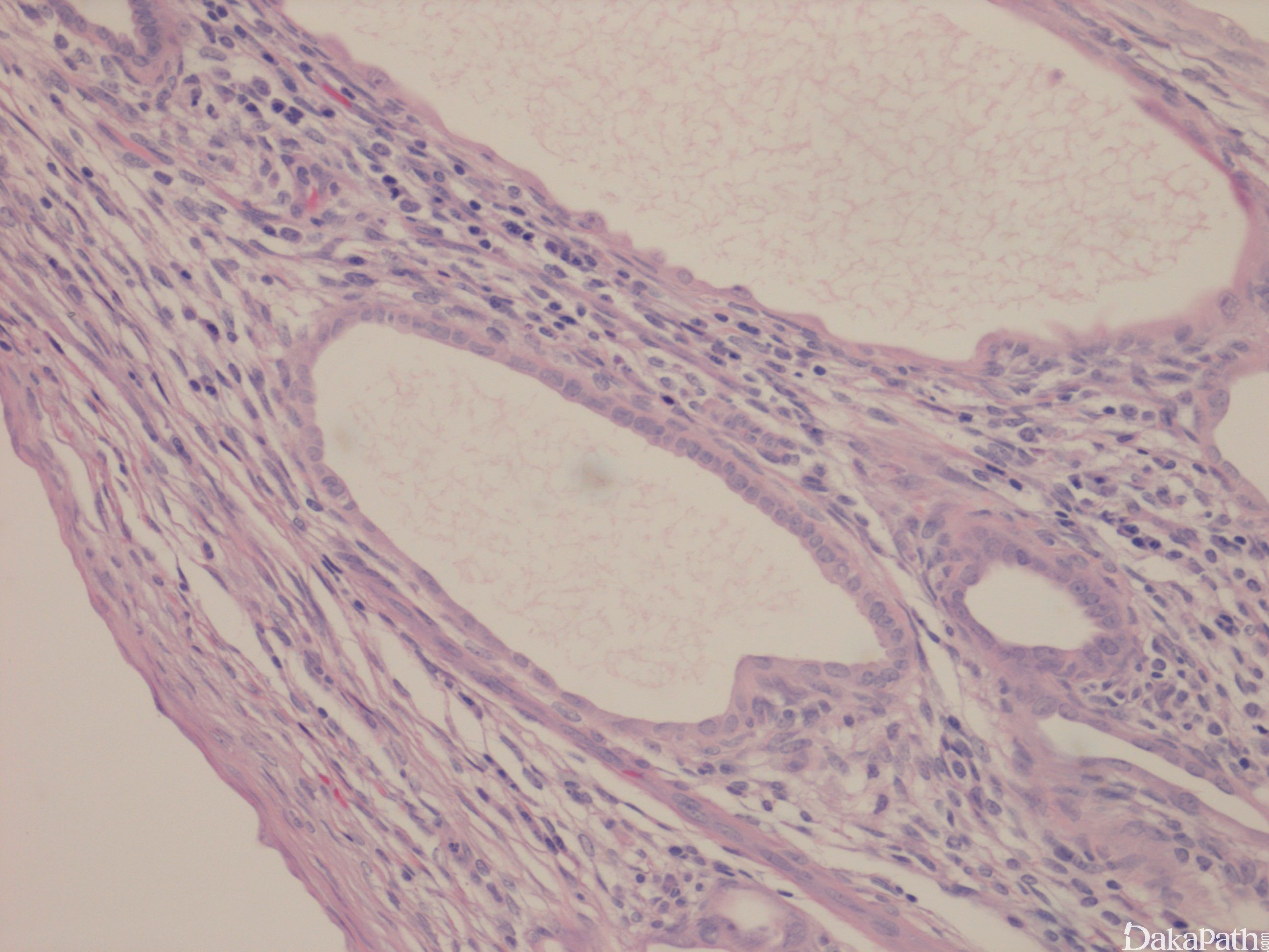 囊肿内衬扁平、立方或鞋钉样上皮细胞,或上皮脱落;