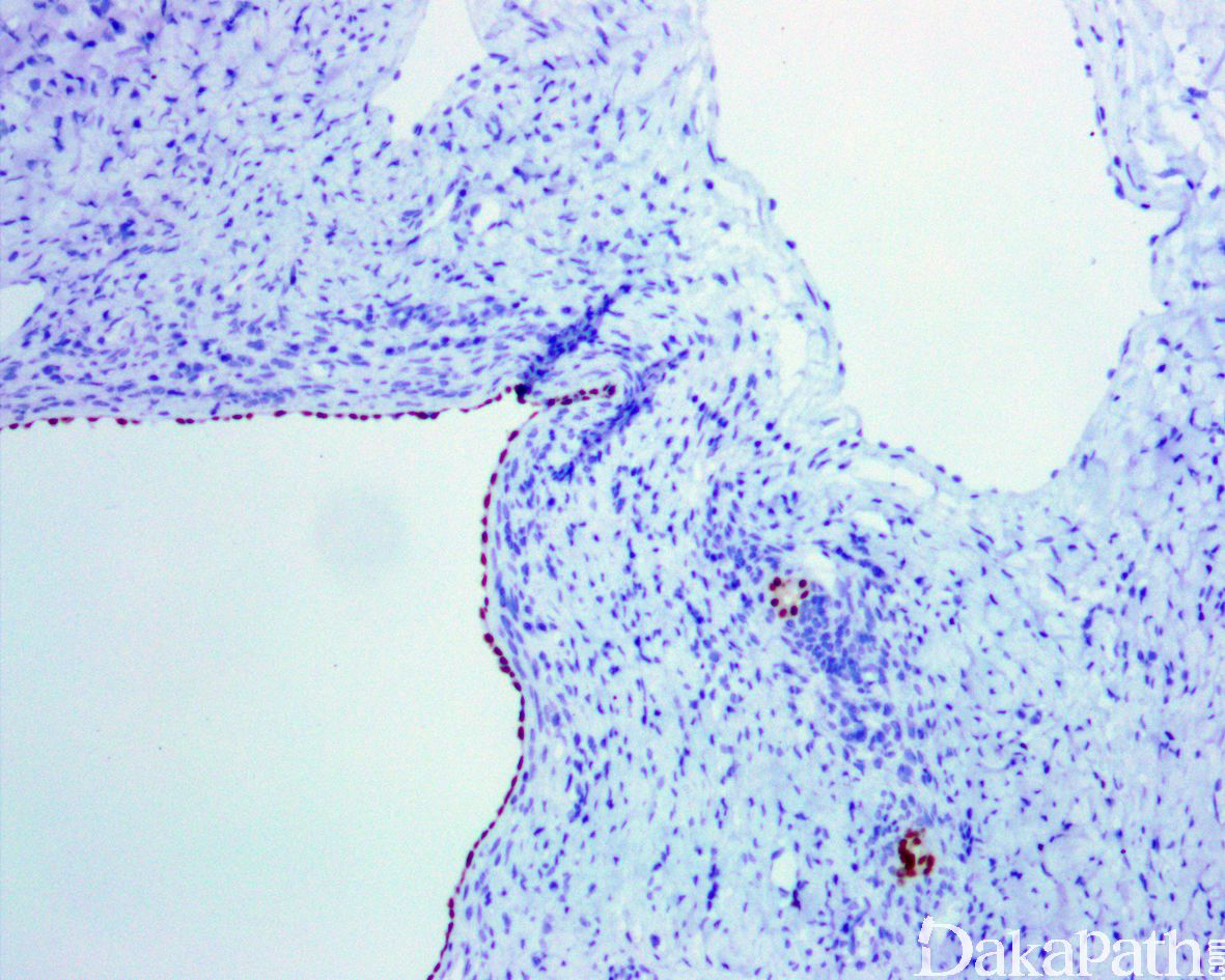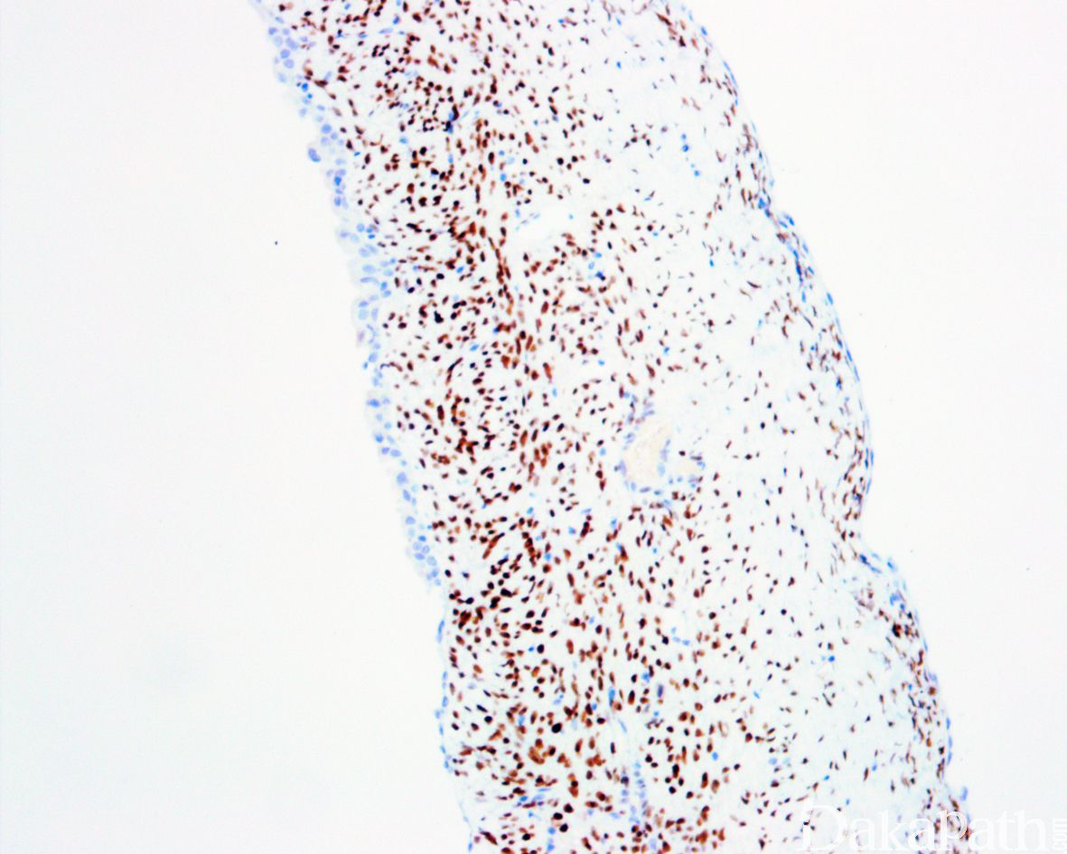 上皮 PAX8 阳性,间质细胞 ER 阳性,Inhibin 阴性。