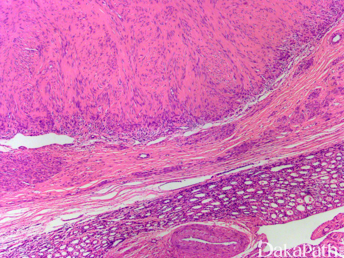 3. 组织形态与发生于后腹膜和子宫部位的平滑肌瘤相同,由梭形细胞交错束状排列构成,也可呈编织状甚至栅栏样排列,间质常见玻璃样和水肿变性;