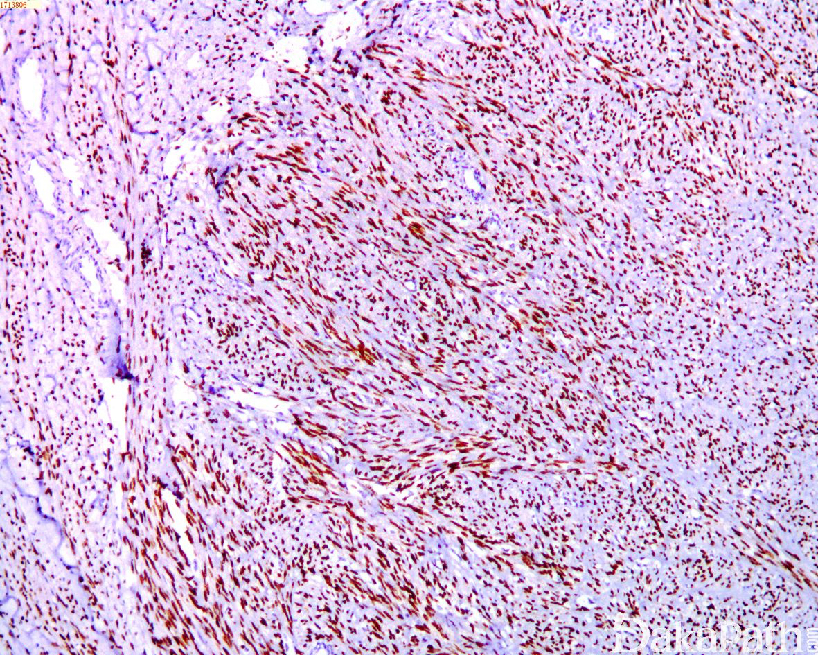 Actin、Desmin、caldesmon 阳性,约 2/3 的肿瘤 ER、PR 以及 WT1 阳性,HMB45,Melan-A,CD34. S100. CK 阴性。