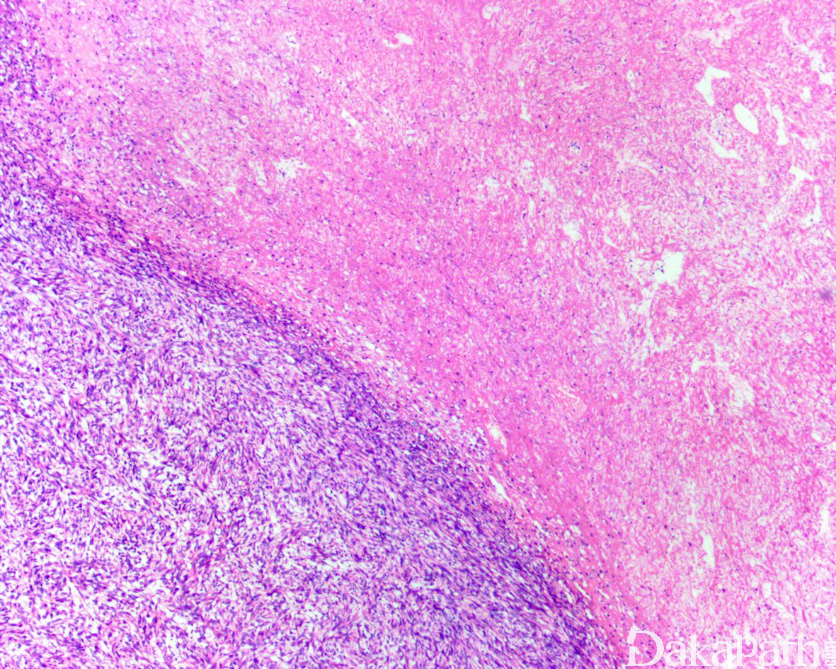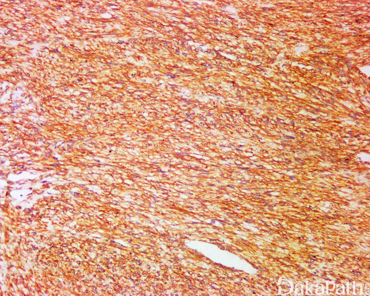 肿瘤细胞梭形,呈栅栏状、丛状或杂乱排列;