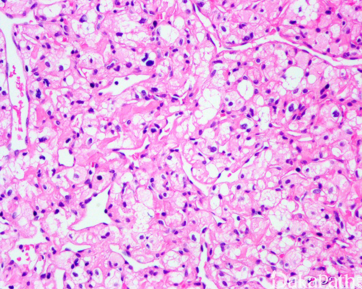 偶尔可见血管母细胞瘤成分与透明细胞肾细胞癌成分混合,提示两者可能是不同分化阶段的谱系肿瘤。