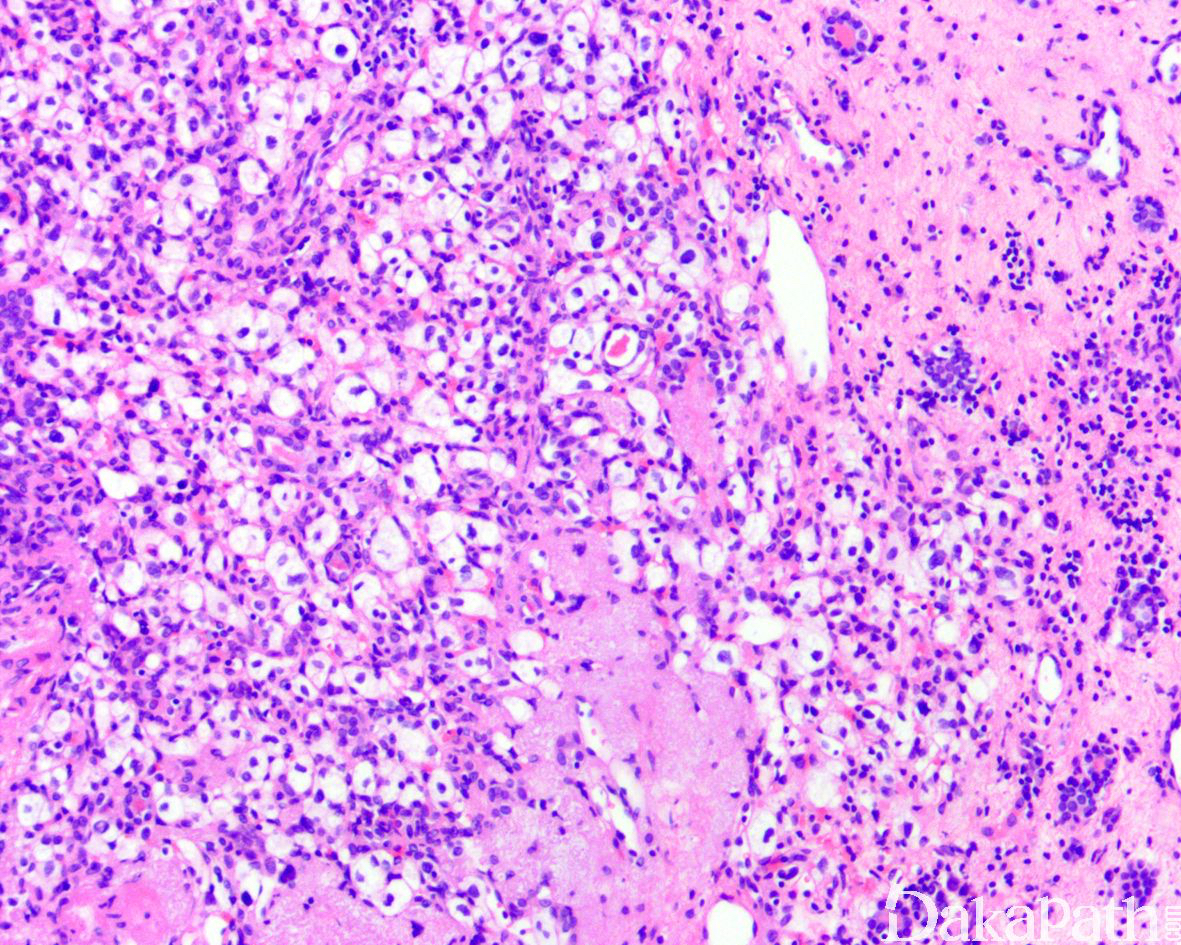 细胞胞浆淡染或嗜酸性,胞浆内多泡状淡染脂质空泡,有些病例可见横纹肌样细胞形态,也可见大的嗜酸性小球和局灶的钙化;