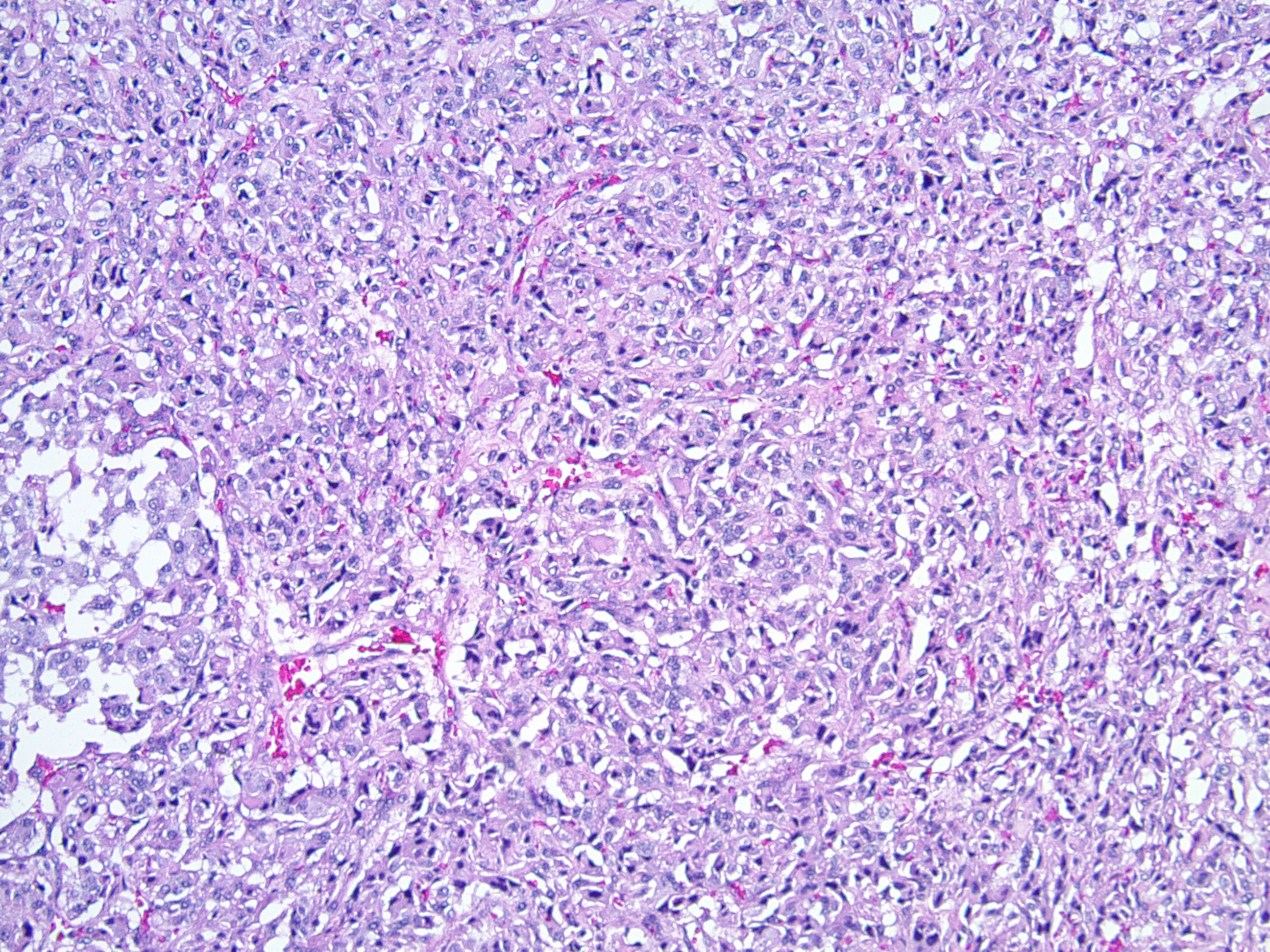 肿瘤细胞大小较一致,胞浆细颗粒状,双染性或嗜酸性,核居中,圆形或卵圆形,核仁明显,染色质粗团块状(椒盐样),偶可见透明细胞、空泡状富含脂质的细胞、嗜酸细胞、或横纹肌样细胞,10 个高倍镜下小于 20 个核分裂。若明显的核增大,形状不规则,则为“多形性”NET。间质数量和纤维化程度不等,坏死较局限,粉刺样。胰岛素瘤中常见淀粉样物,生长抑素瘤中常见腺样结构并含有沙砾体。