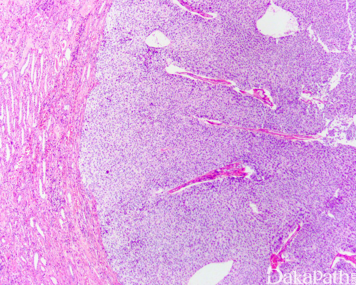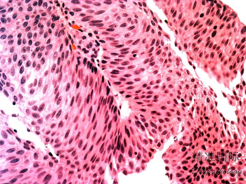 高级别乳头状尿路上皮癌:乳头被覆上皮显示明显的排列紊乱和细胞异型性,乳头常见融合,低倍镜下即可感知明显的结构和细胞的异常。肿瘤细胞极向紊乱,具有多形性核,核仁明显,核分裂像常见,上皮层次厚薄不均,邻近肿瘤的粘膜常见尿路上皮原位癌改变。