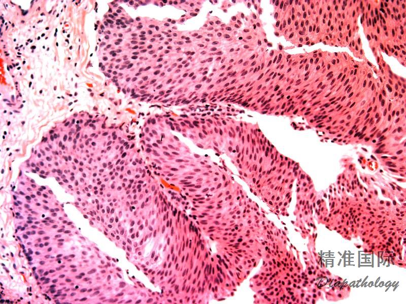 核轻度增大,可见空泡状染色质,常见核仁,核分裂可见于上皮的任何层次,但多位于基底部;