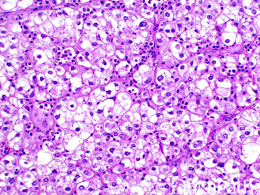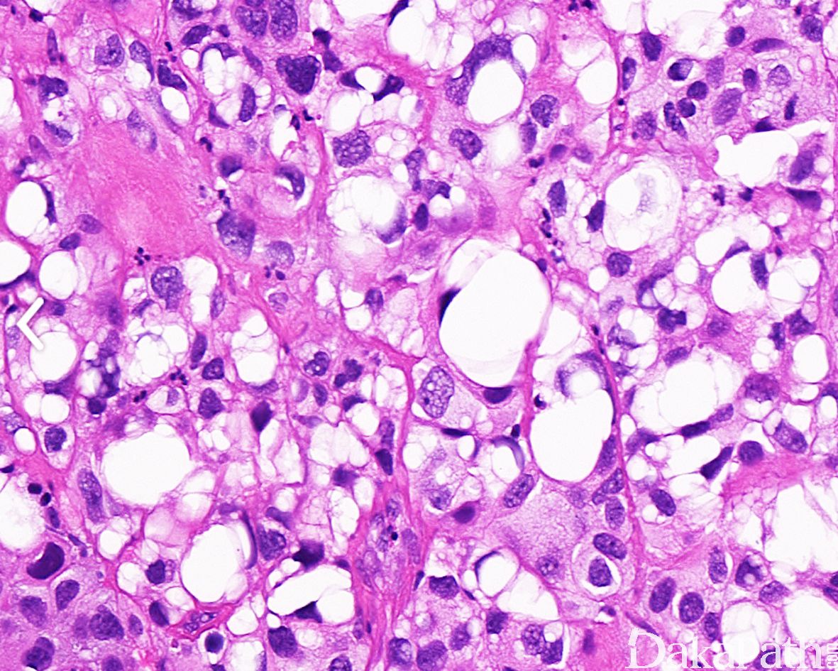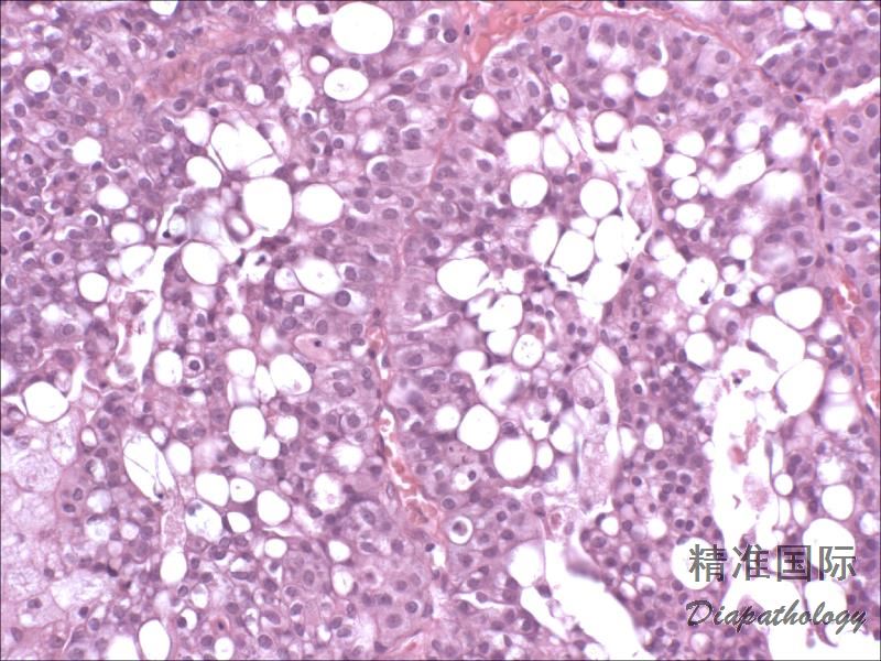 透明细胞尿路上皮癌 :胞浆水样透明,无脂质空泡,无核挤压的切迹,胞浆内物质 PSA 阳性。