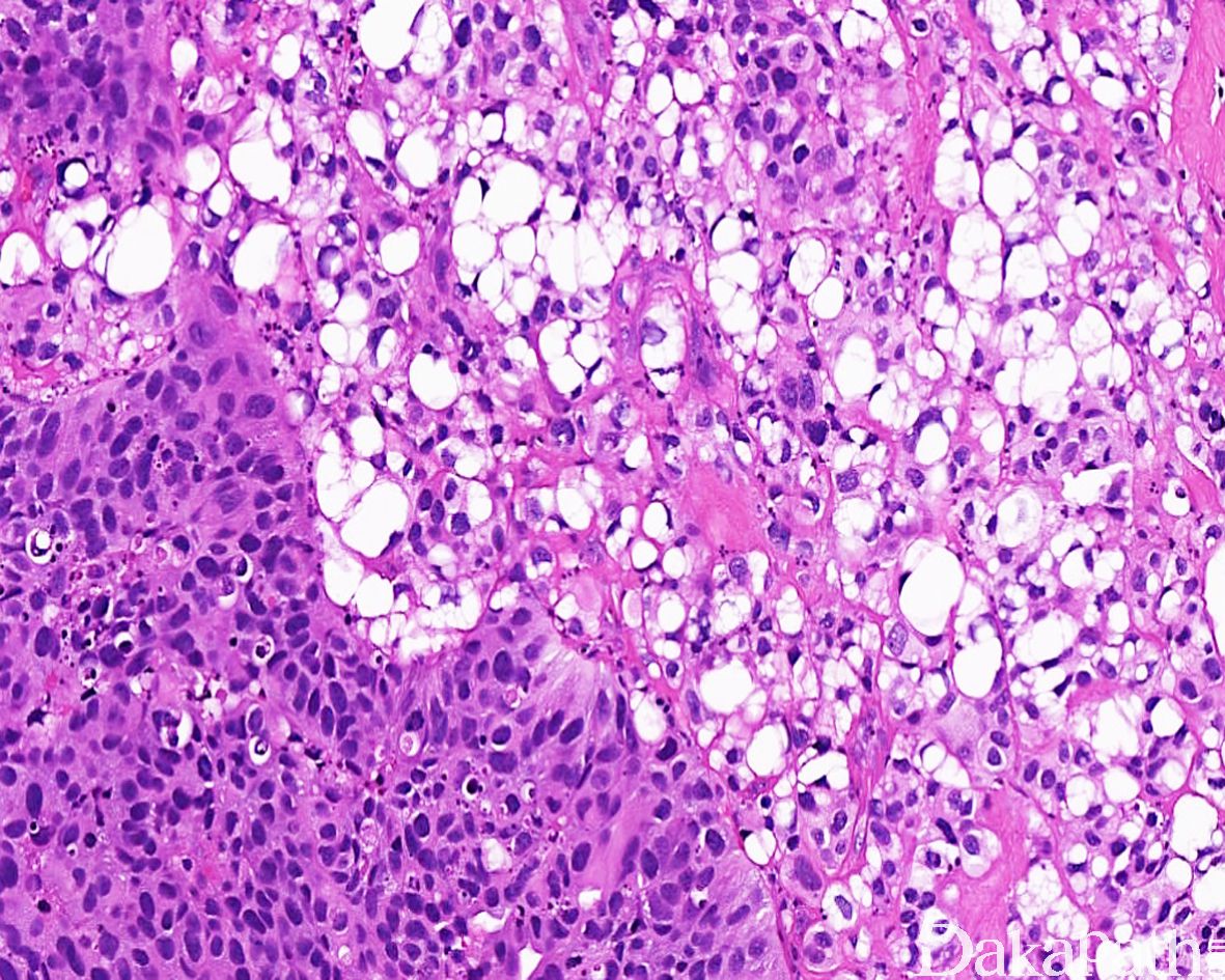 常和其它类型或普通型尿路上皮癌混合存在,脂质细胞通常占肿瘤成分的 10%-50%,