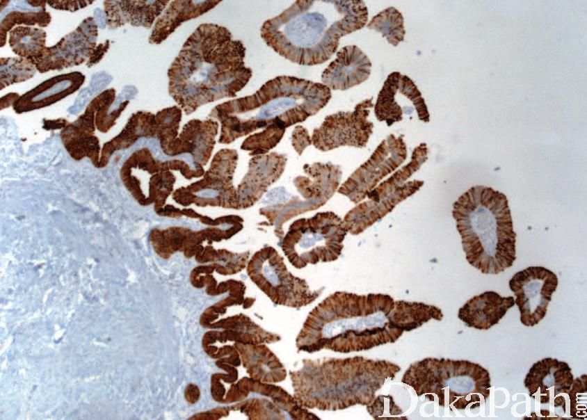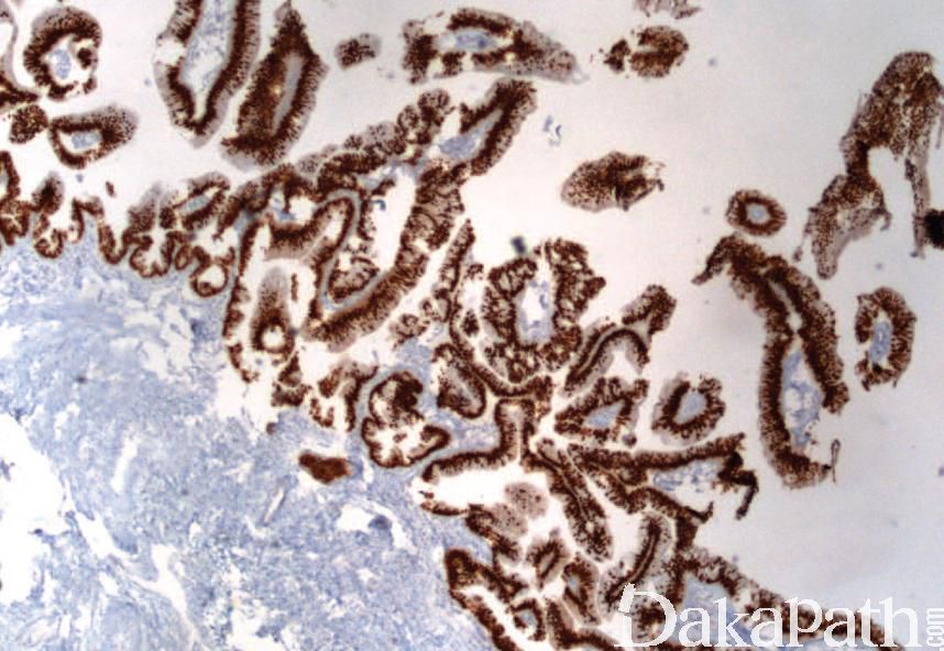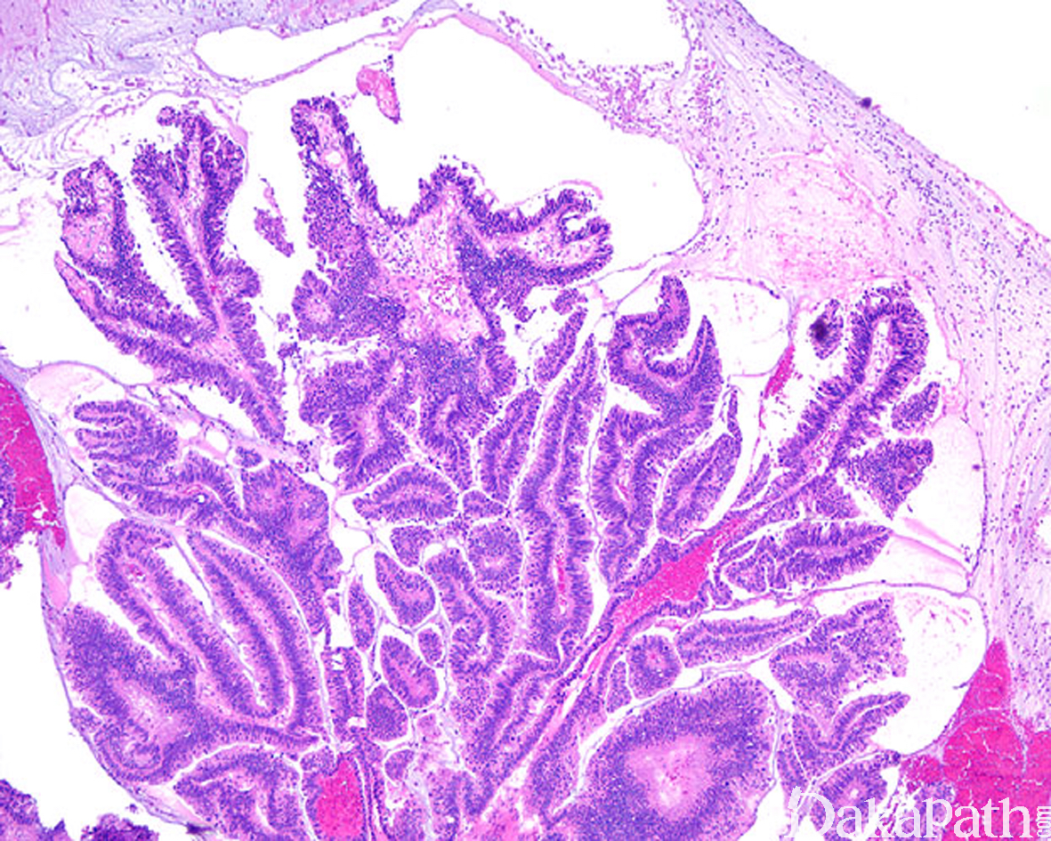 - 上皮具不同程度的异型性,多数呈低级别上皮内瘤变,也可见高级别上皮内瘤变甚至原位癌;约 35%伴随有浸润性腺癌;