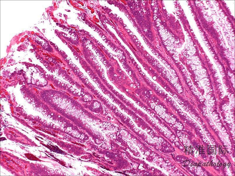 - 镜下呈具有纤维血管轴心的乳头状结构,或尖锐或钝性指状突起,被覆肠型上皮;有时可表现为管状腺瘤或管状绒毛状腺瘤;