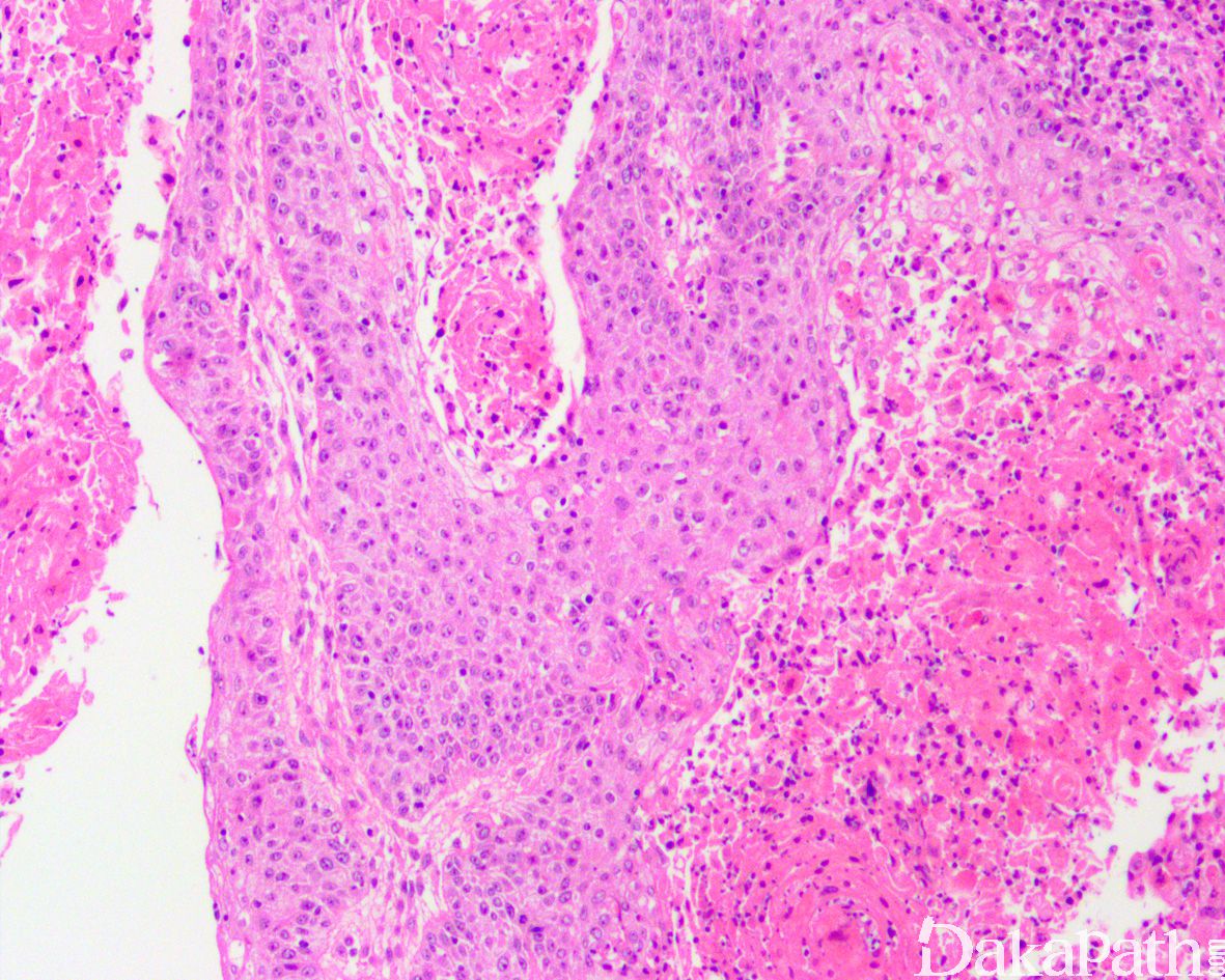 疣状癌:为特别高分化的鳞状细胞癌亚型,肿瘤由外生性的乳头状瘤样结构组成,细胞缺乏明显的异型性。基底为宽基的推挤状生长而非浸润性生长。