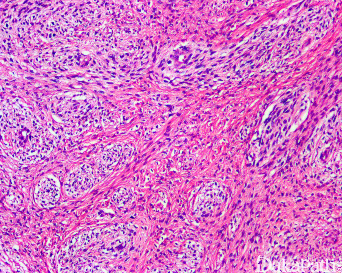 血管周围常见密集的瘤细胞,瘤细胞似施万细胞的形态特点,核深染,核端呈圆形或锥形,核分裂像易见,可呈细长的波浪状;