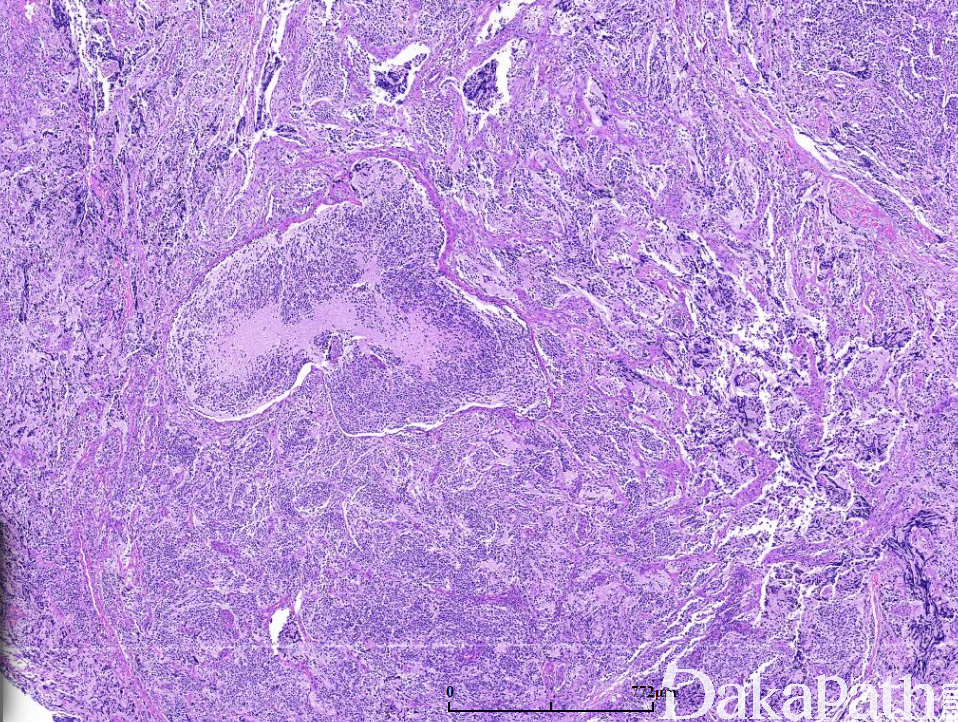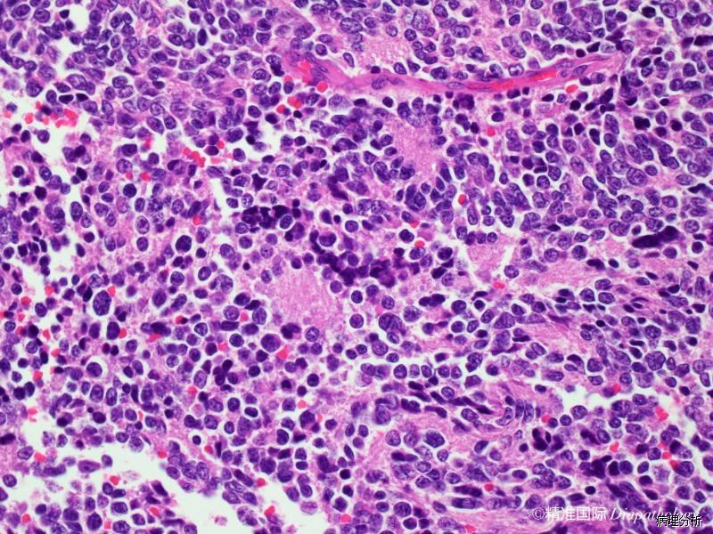 9. 在未分化型的神经母细胞形态学基础上,在局灶区域或明显可见神经纤维网(神经毡)和(或)Homer-Wright 菊形团(约 30%):1 层或数层神经母细胞围绕中央的神经毡性间质呈放射状排列;