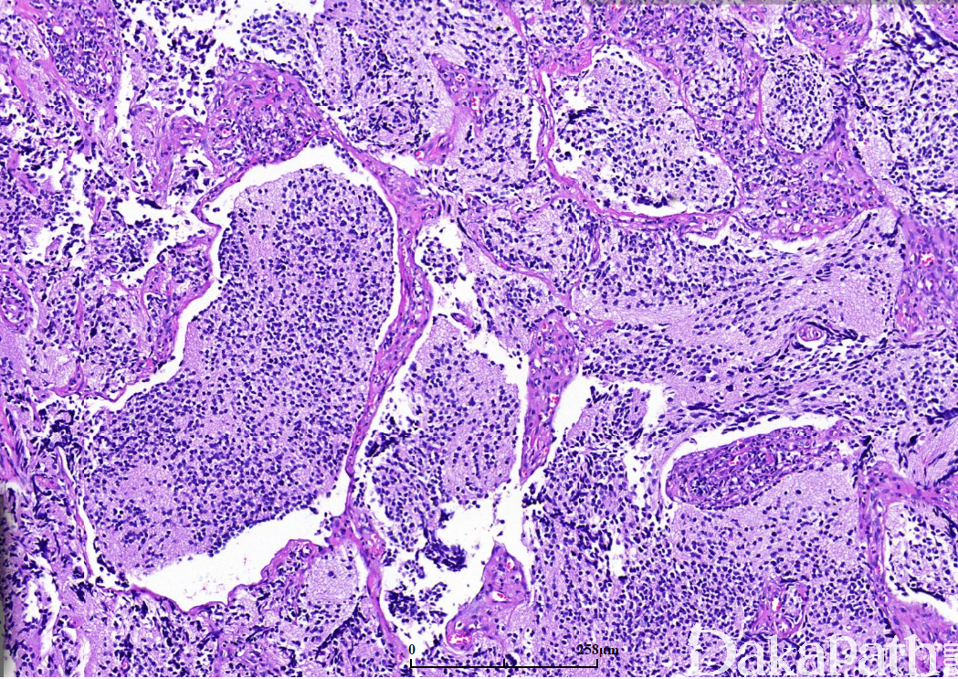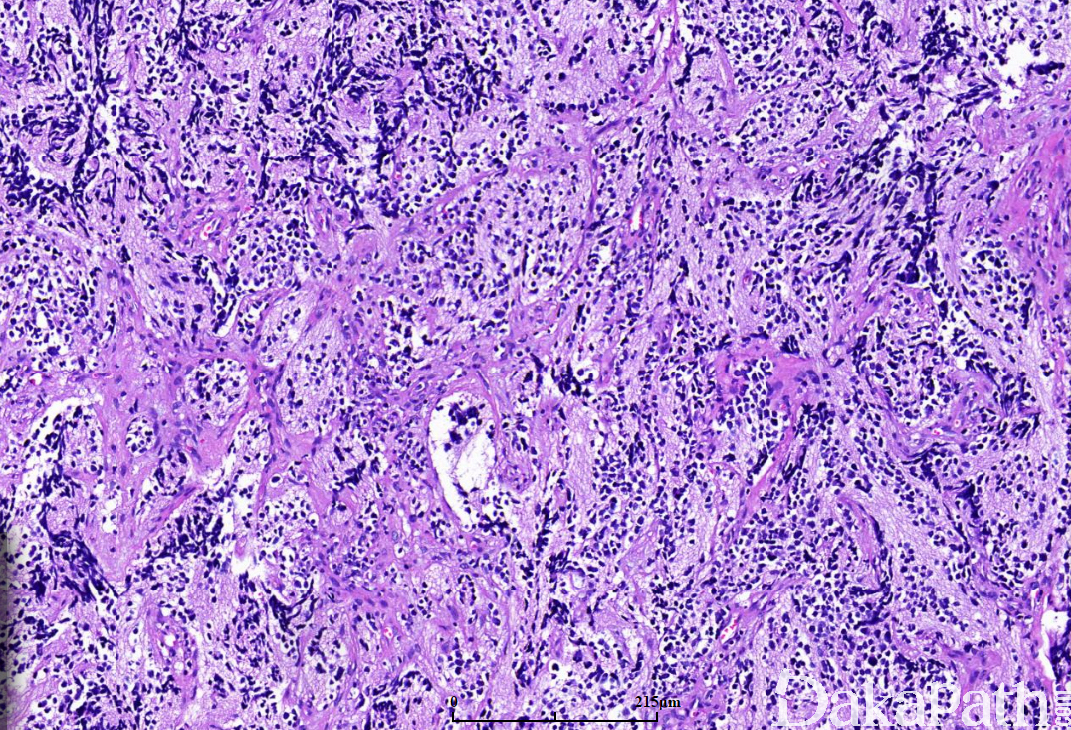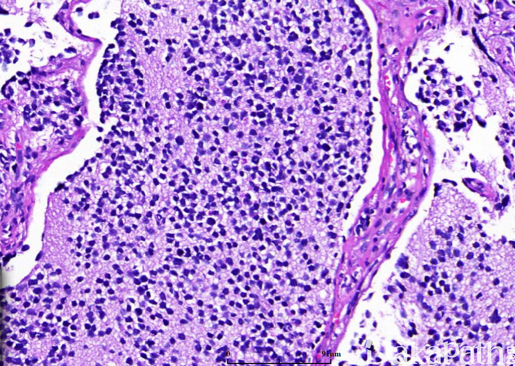 4. 由巢状或小叶状分布的小至中等大神经母细胞所组成,巢或小叶之间为纤细的纤维血管性间隔;