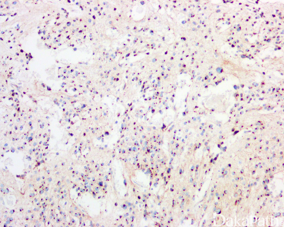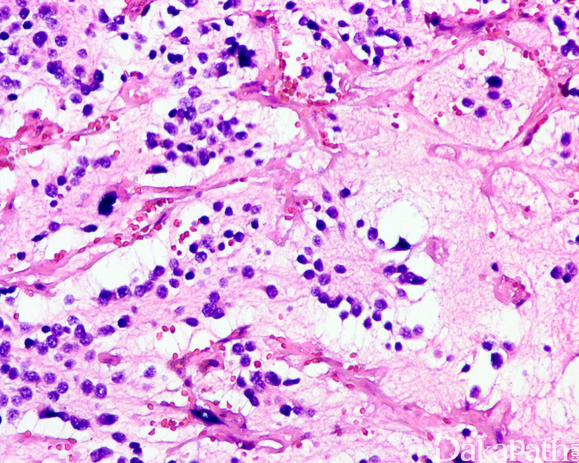 11. 偶见体积较大、异型性较明显的瘤细胞伴有开放的染色质和显著的核仁,少数可表现为 Rhabdoid 的胞浆特征;