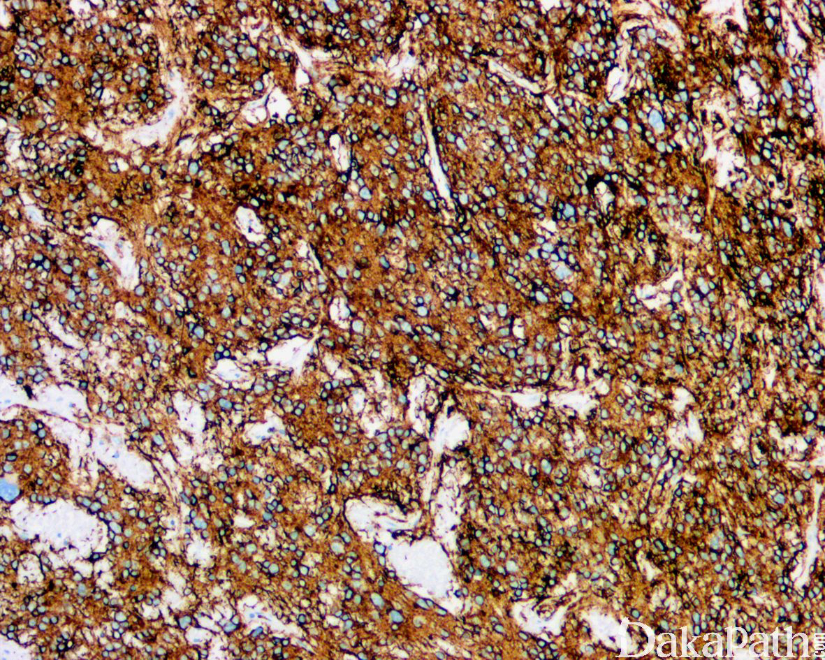 NSE 弥漫强阳性、NF、Leu-7. PHXO2B 等阳性;亦常见 synaptophysin、chromogranin、CD56 及 PGP9.5 阳性。未分化的神经母细胞弥漫表达 cyclind1 而神经节细胞不表达,GFAP、MBP、CD99 和 β-2 微球蛋白均为阴性。施万间质呈 S100 阳性。与 N-MYC 扩增相关的肿瘤可过表达 N-myc。