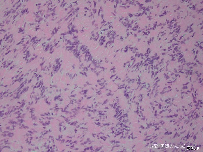少数病例间质显著黏液变性,类似神经鞘黏液瘤或其他黏液性软组织肿瘤;