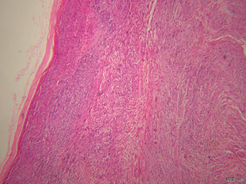 2. 恶性周围神经鞘膜瘤 : 常较大较深;细胞学从单一形态到多形态,核分裂易见;常见肿瘤坏死;S1OO 阴性或灶阳,低级别肿瘤 S100 弥漫阳性。