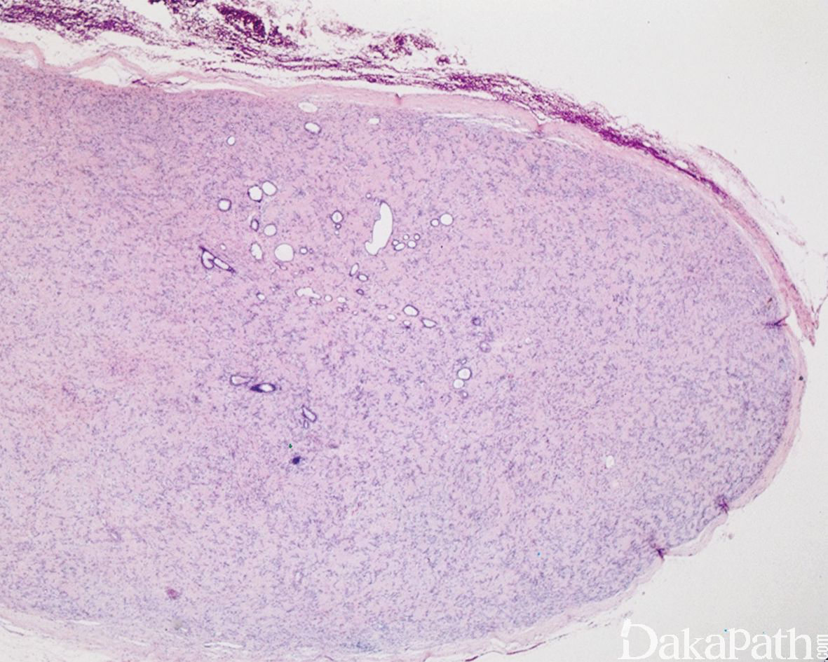 镜下在经典的神经鞘瘤背景上可见多少不等的散在的、大小和形态不一的腺样结构;