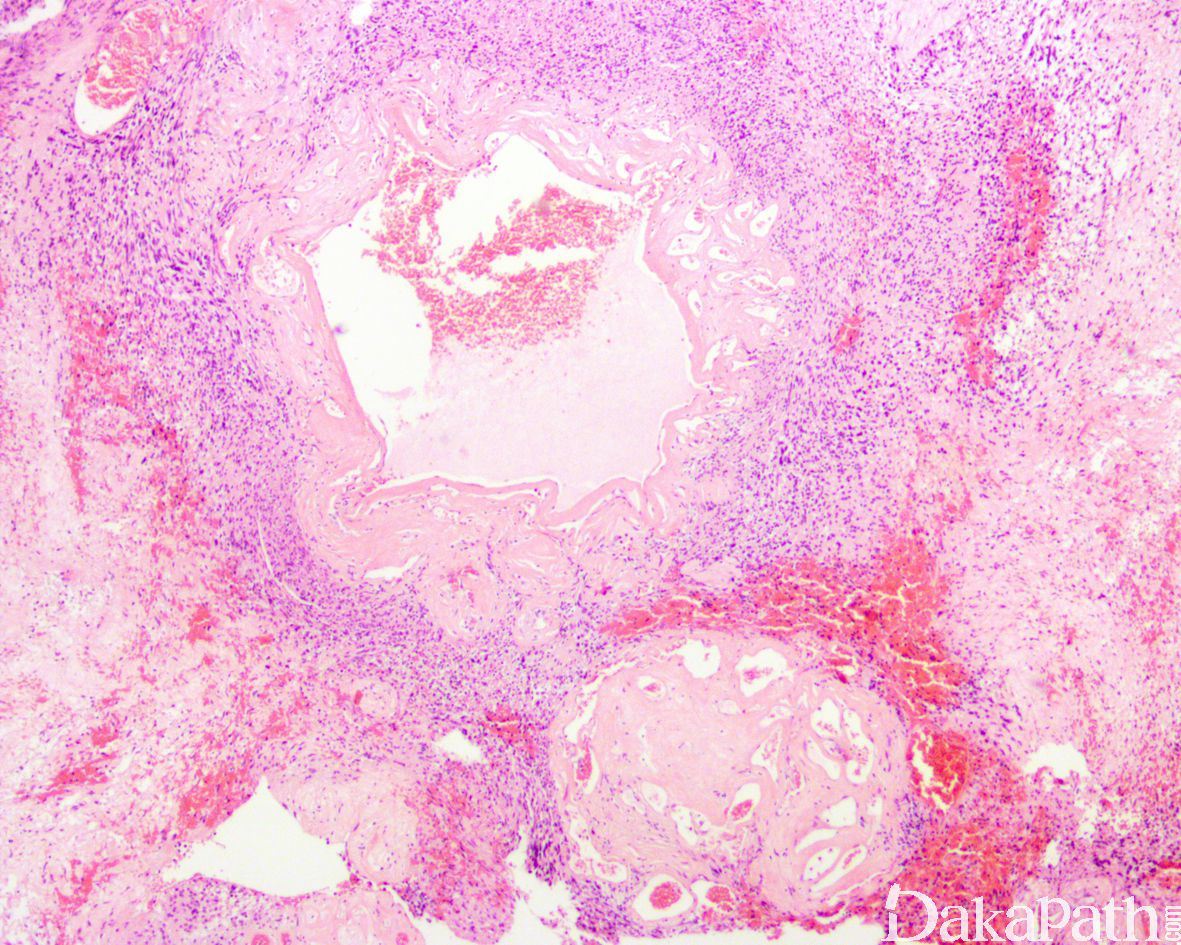 2. 退行性改变主要表现为囊性变、钙化、陈旧性出血及机化、间质内或血管周围广泛而明显的透明样变性等;