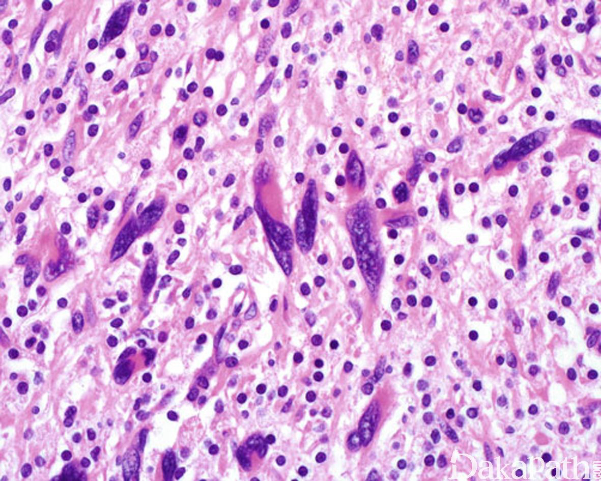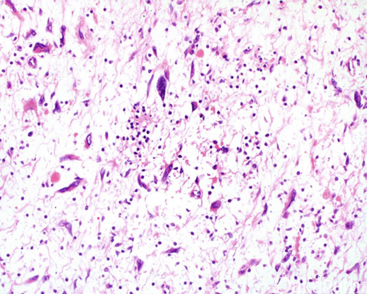 在神经纤维瘤形态学结构基础上,出现散在、核大、染色质呈污浊状,核仁不明显,核内可见胞质性的包涵体的核异型细胞,无核分裂像。
