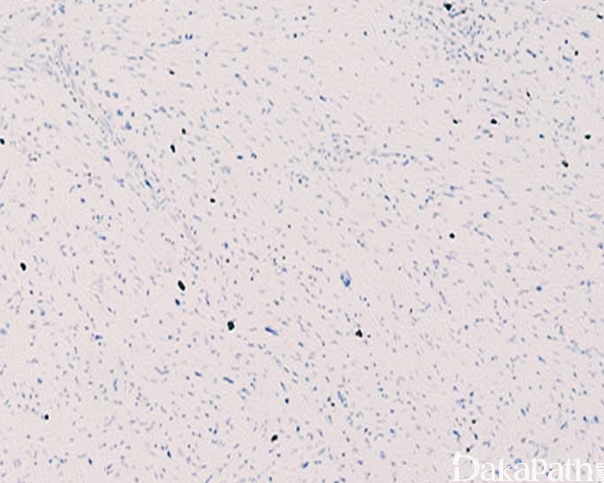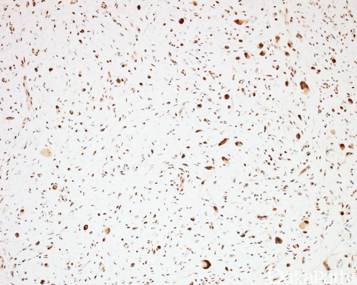 S-100. MBP、XIIIa、CD34 阳性,可见 EMA 阳性神经束膜细胞,NF 阳性的轴突成分;P53 阴性,Ki67 增殖指数低,H3K27me3 无表达丢失;多数病例无表达缺失,少数可出现表达缺失。