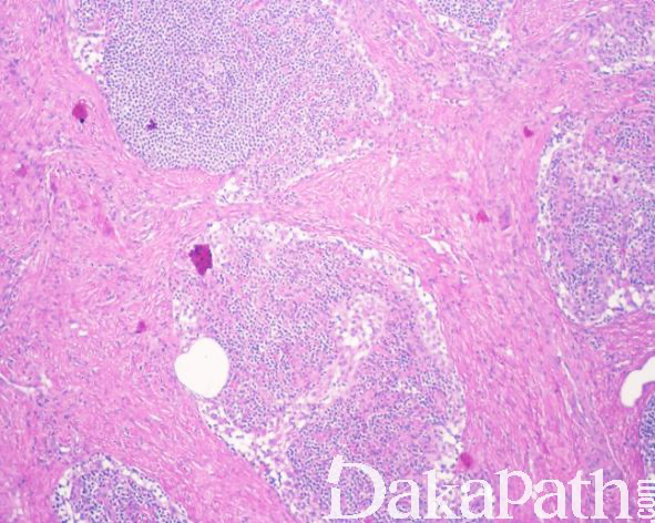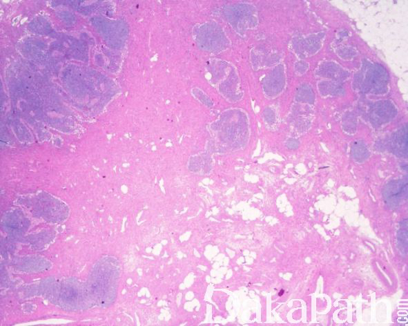 3. 镜下病变占据淋巴结的比例从 15%-90%,平均约 60%;