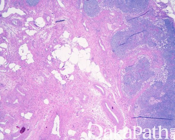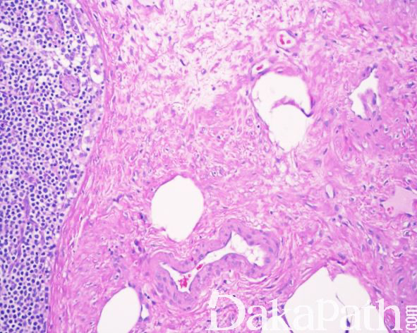 淋巴结内淋巴管平滑肌瘤病: 与淋巴结内血管肌性错构瘤存在组织学上的重叠,与后者不同,淋巴结内淋巴管平滑肌瘤病多与结节性硬化症有关,几乎总是发生于成年女性 ,多见于盆腔和主动脉旁淋巴结;早期病变主要分布于被膜下窦而非淋巴结中央,常累及至淋巴结外的结缔组织和淋巴管内生长,梭形肌样细胞呈致密的巢状或束状排列由挤压的分支状淋巴管所分隔,无胶原纤维的背景,无广泛的厚壁血管聚集,罕见脂肪组织,免疫组化染色表达 HMB45. Melan-A、ER 和 CathepsinK 等。