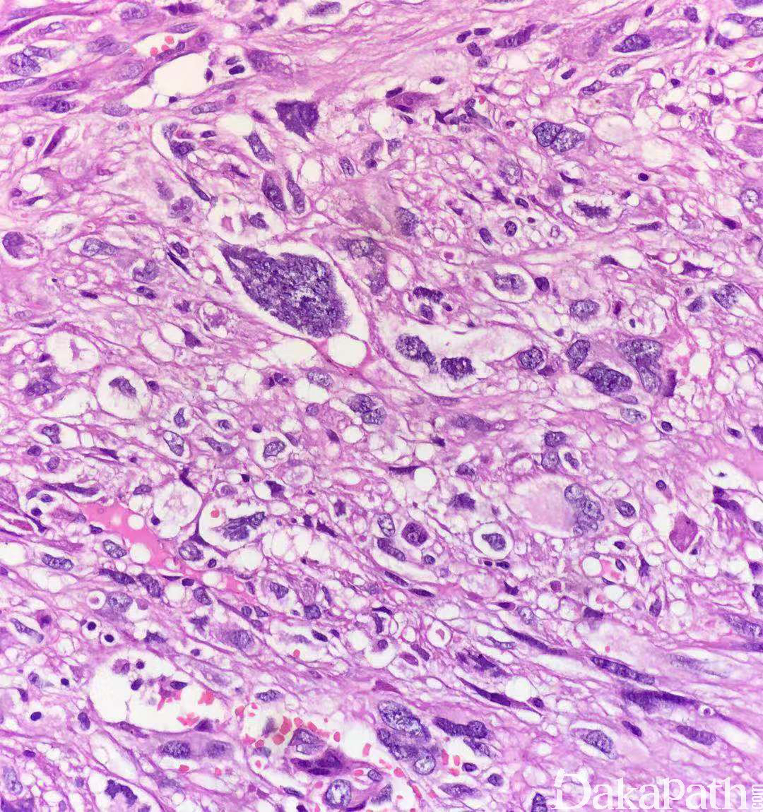 瘤细胞显示明显的多形性和异型性,核大、深染,常见多核瘤巨细胞,核分裂像易见,可见病理性核分裂像;