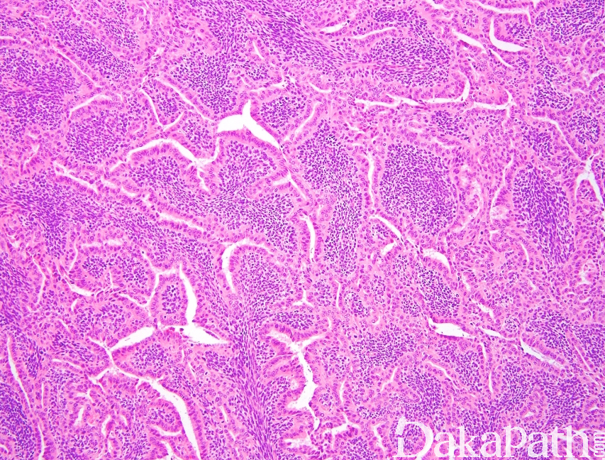 - 单向上皮性滑膜肉瘤: 1)主要由上皮样瘤细胞构成,排列成腺样或不规则的裂隙,裂隙内可含黏液或浆液;腺体被覆上皮为高柱状、立方形或扁平型,有些向腔内呈乳头状;