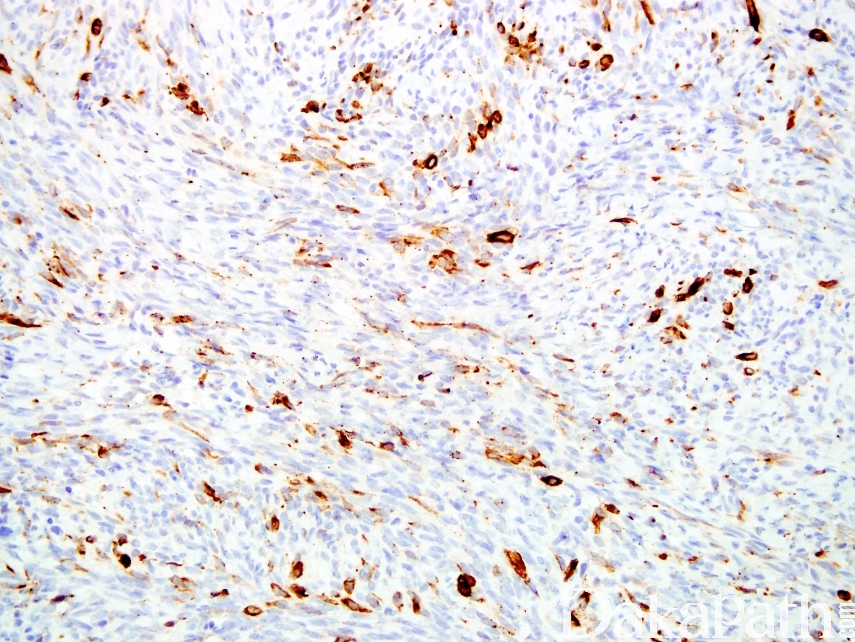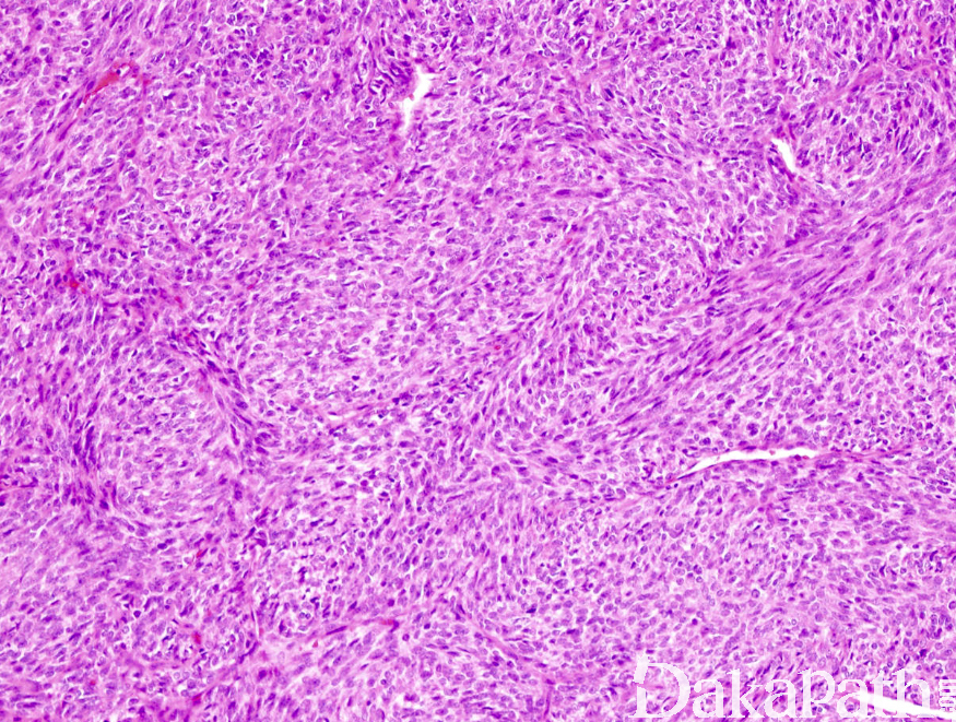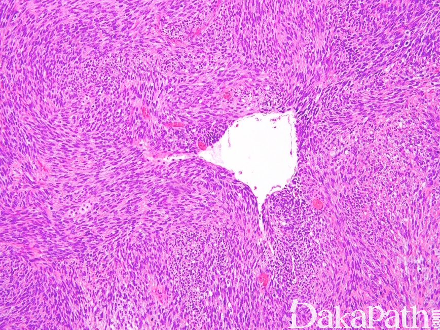 - 单相梭形细胞型滑膜肉瘤: 1)瘤组织主要由短条束状或漩涡状排列的梭形瘤细胞构成; 2)分化差者可呈长条束状、鱼骨样或人字形排列; 3)瘤细胞间常有肥大细胞浸润,甲苯胺蓝、Gimesa 染色或 CD117 标志物可清晰显示,对滑膜肉瘤的诊断有提示意义; 4)部分病例可有“鹿角样”血管; 5)梭形细胞型瘤细胞易发生透明变性,黏液变性,局灶性钙化等;