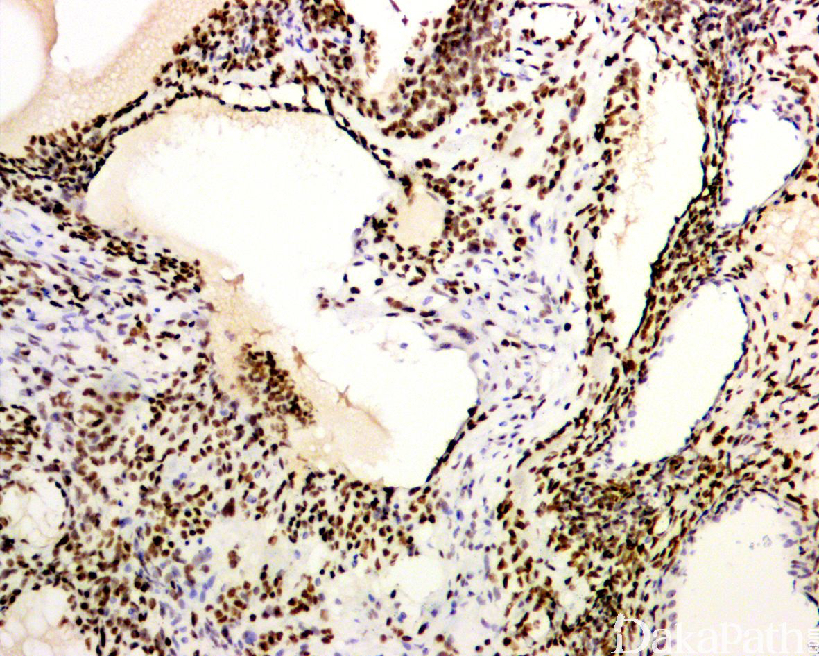 根据组织形态及分化程度不同,可分为双向型滑膜肉瘤、单向梭形细胞型滑膜肉瘤、单相上皮性滑膜肉瘤、低分化型滑膜肉瘤、高分化型滑膜肉瘤、硬化性滑膜肉瘤: 1)双相型滑膜肉瘤:由比例不等的上皮样瘤细胞和梭形细胞组成,两种细胞之间有移行; 2)上皮样细胞: a)呈立方形或柱状,胞质丰富、嗜酸性或清亮,核圆形、卵圆形,呈空泡状; b)常形成腺样结构,腺腔内可见嗜伊红色的分泌物; c)还可排列成小管状、条索状或实性团块状、甚至腺泡状或乳头状,乳头轴心为梭形瘤细胞,而非纤维结缔组织; d)上皮样细胞巢周与梭形细胞之间缺乏典型的基膜; 3)梭形细胞: a)形态较一致,梭形或短梭形,核梭形或卵圆形,深染、核仁不明显,胞质少而不清晰,瘤细胞核质比大,以致核呈重叠状; b)细胞多呈实性片状或束状排列,也可呈栅栏状或鱼骨样排列,类似纤维肉瘤或恶性周围神经鞘膜瘤; c)梭形细胞间可含有多少不等的胶原纤维,呈粗细不等的带状或绳索样;间质也可出现局灶性黏液变性;