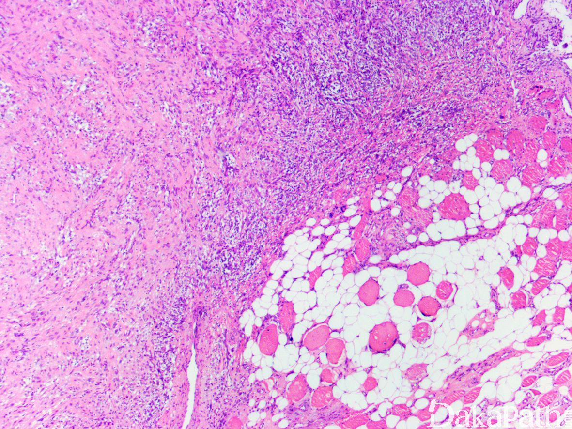 3. 镜下肿瘤界限不清,梭形瘤细胞较密集,呈平行的束状和片状排列,肿瘤一致性的显示向周围脂肪组织和骨骼肌组织内不同程度的浸润性生长,组织学构型类似于脂肪纤维瘤病;