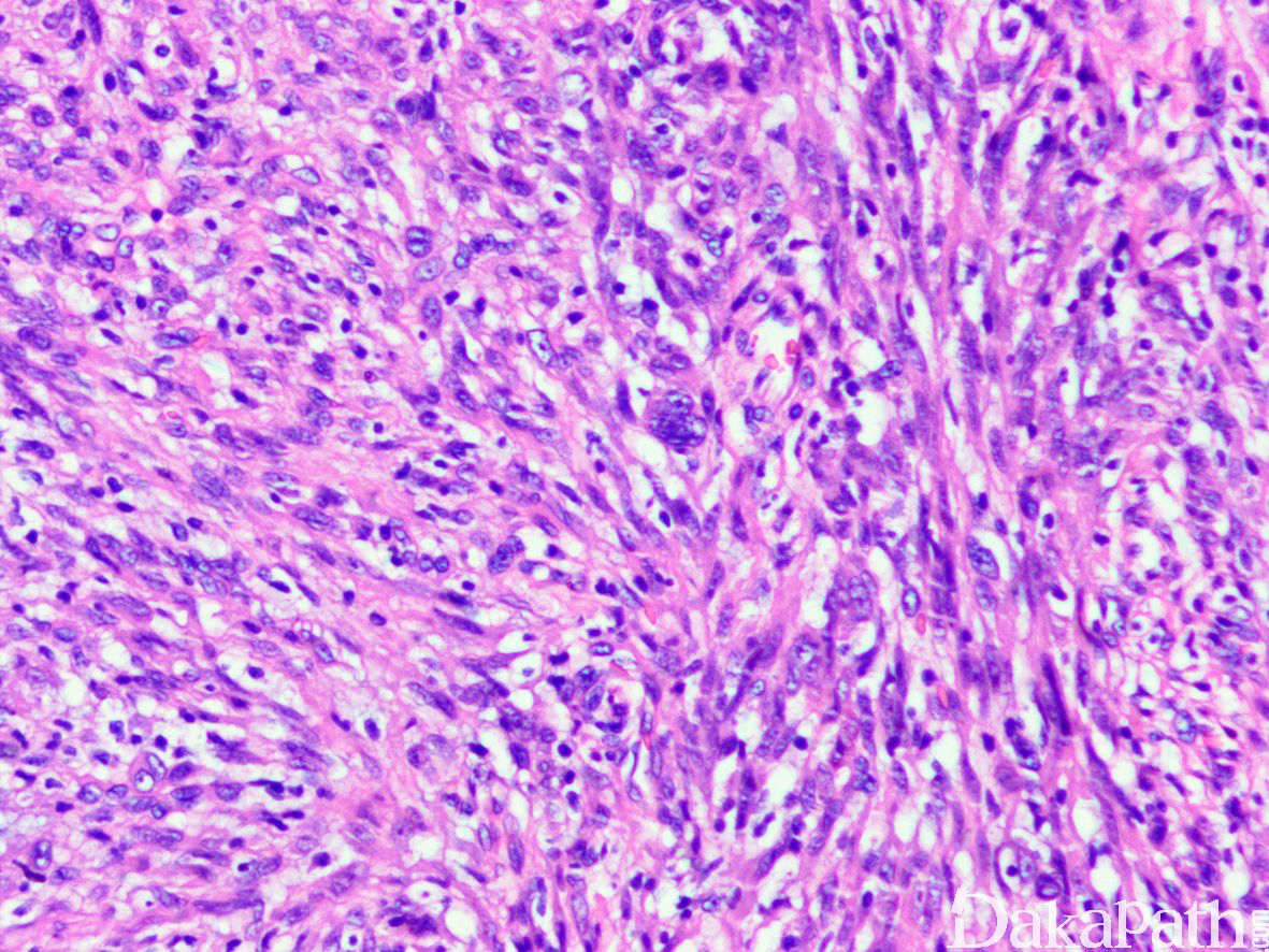 4. 瘤细胞胞浆嗜酸性,胞膜界限不清,核呈纺锤状,可见轻度的核非典型性和核浓染,核仁不明显,散在可在多形性肿瘤细胞;