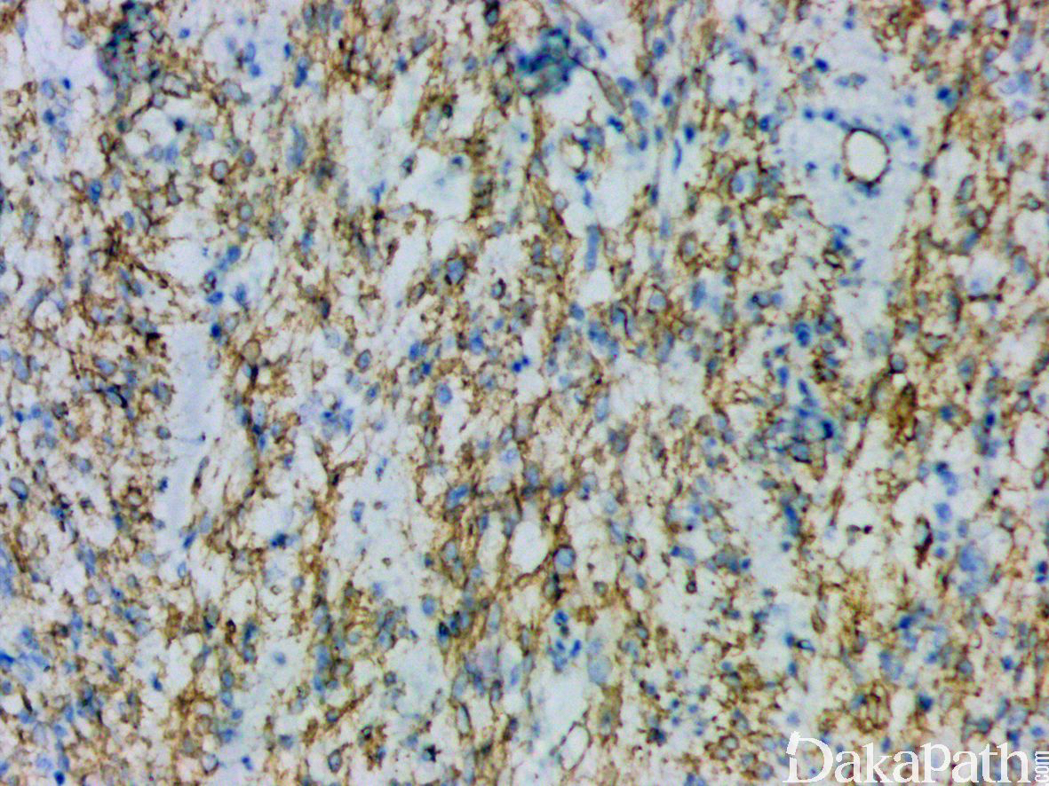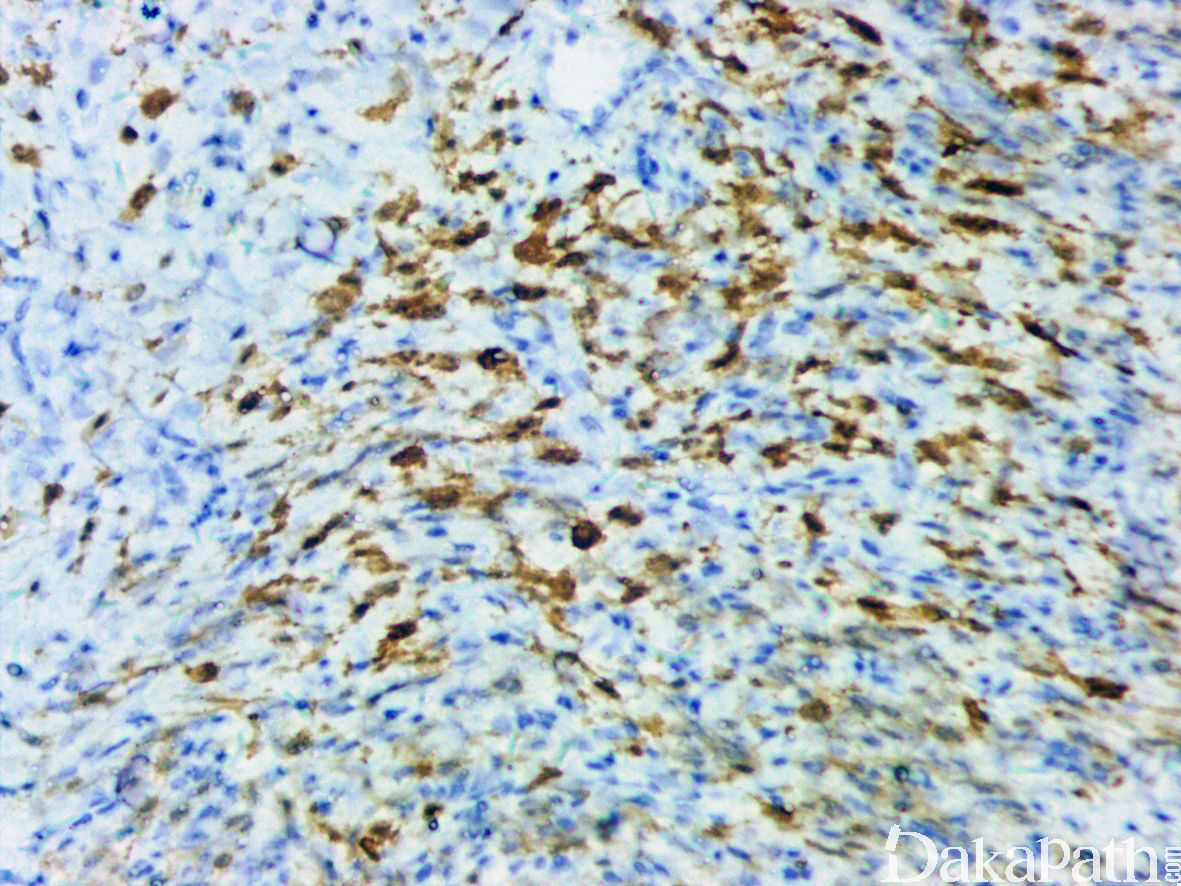 多灶性的强表达 S100 蛋白和 CD34,NTRK1 基因重排的病例弥漫表达 NTRK1 蛋白;少数肿瘤可局灶表达 SMA,一般不表达 desmin, EMA, GFAP、SOX10,HMB45,STAT6 等,H3K27me3 表达无丢失。