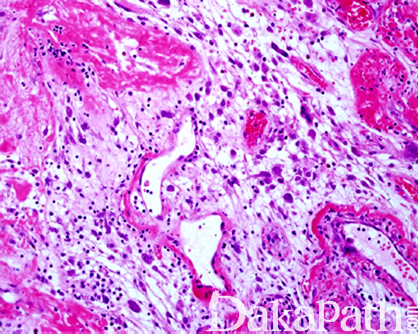 4. 血管腔内常见血栓形成,血管壁附着一层厚的嗜伊红色纤维素样坏死性物质;