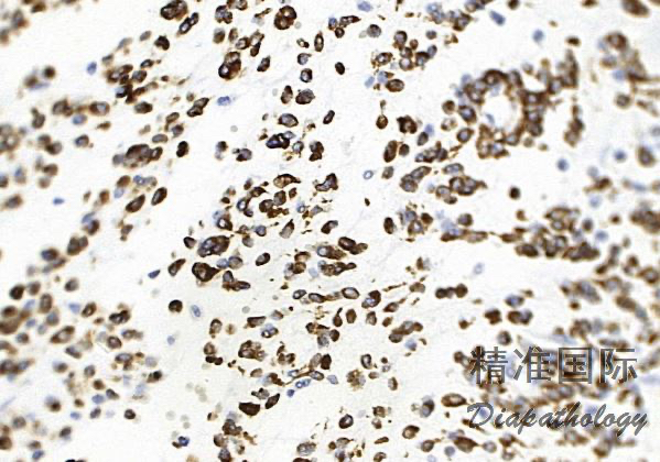 弥漫表达 desmin,不同程度表达 myogenin 和 myoD1, 局灶表达 SMA 和 HHF35, 仅少数表达 myoglobin, 偶尔表达 CK 以及 S100 蛋白