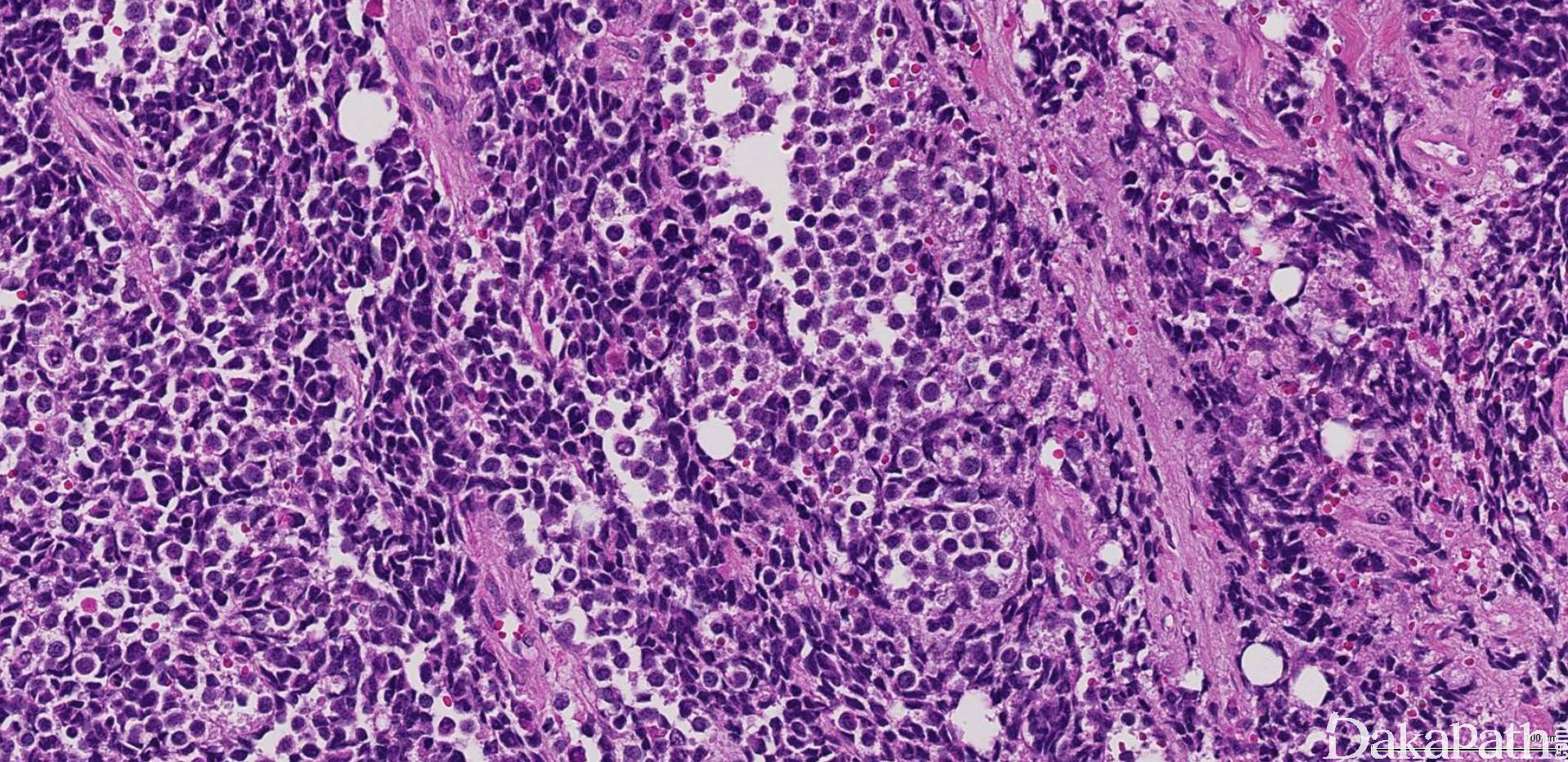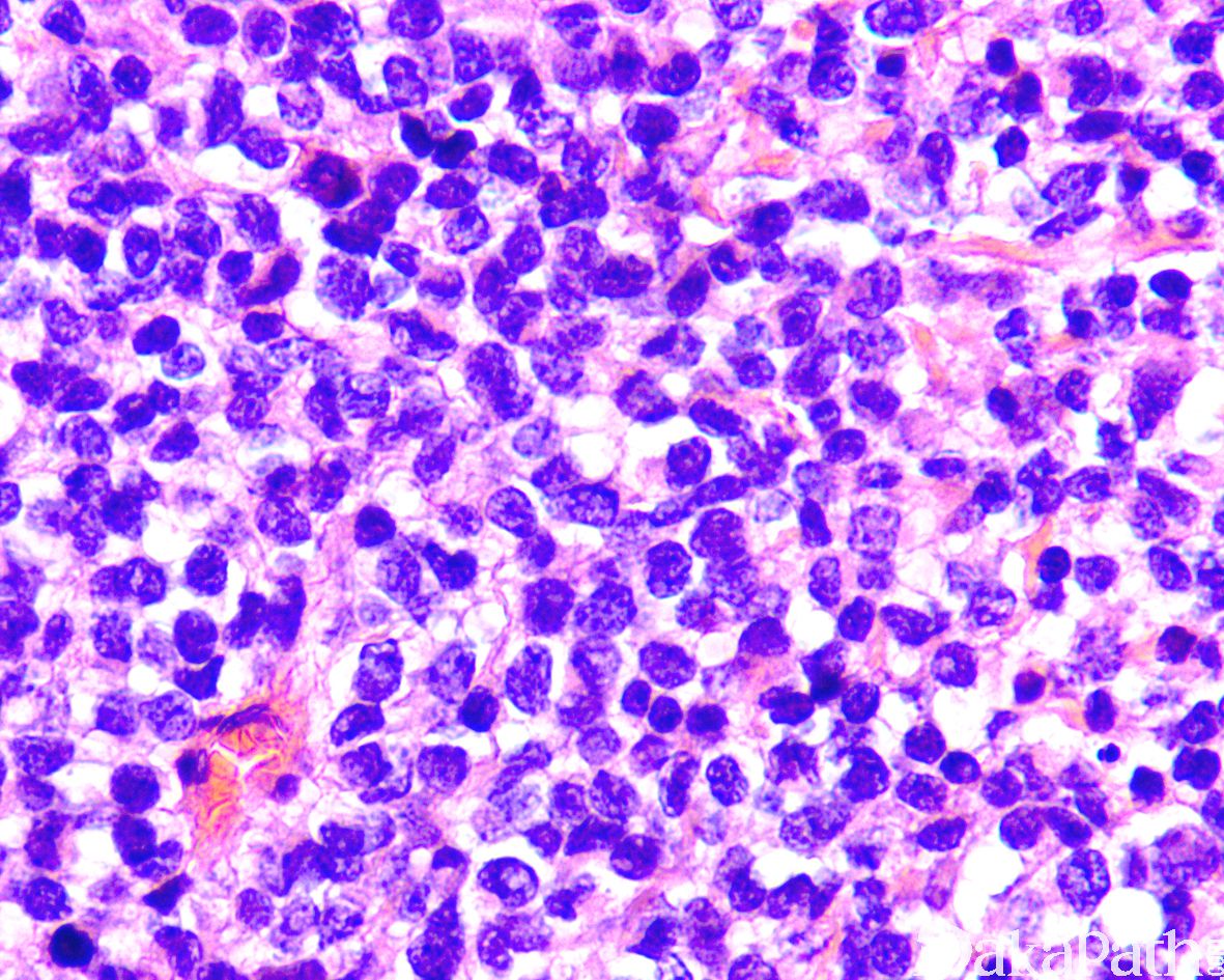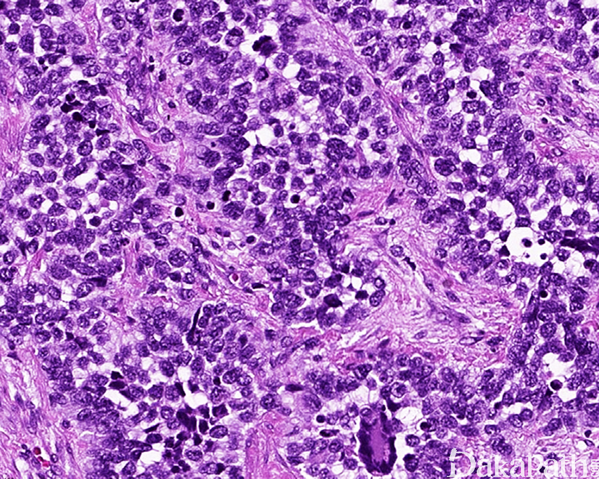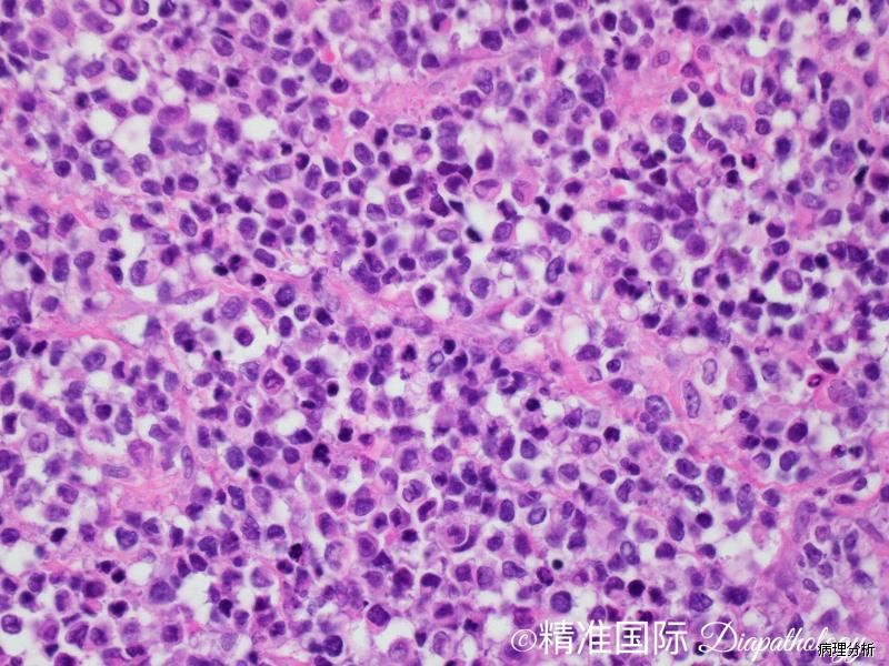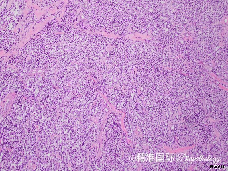 2. 致密胚胎性横纹肌肉瘤:主要需要与实体性腺泡状横纹肌肉瘤鉴别,致密胚胎性横纹肌肉瘤的瘤细胞多成角,染色质粗糙,免疫组化染色 myogenin 通常为散在阳性,遗传学上无 PAX7/3 和 FOXO1A 基因融合。