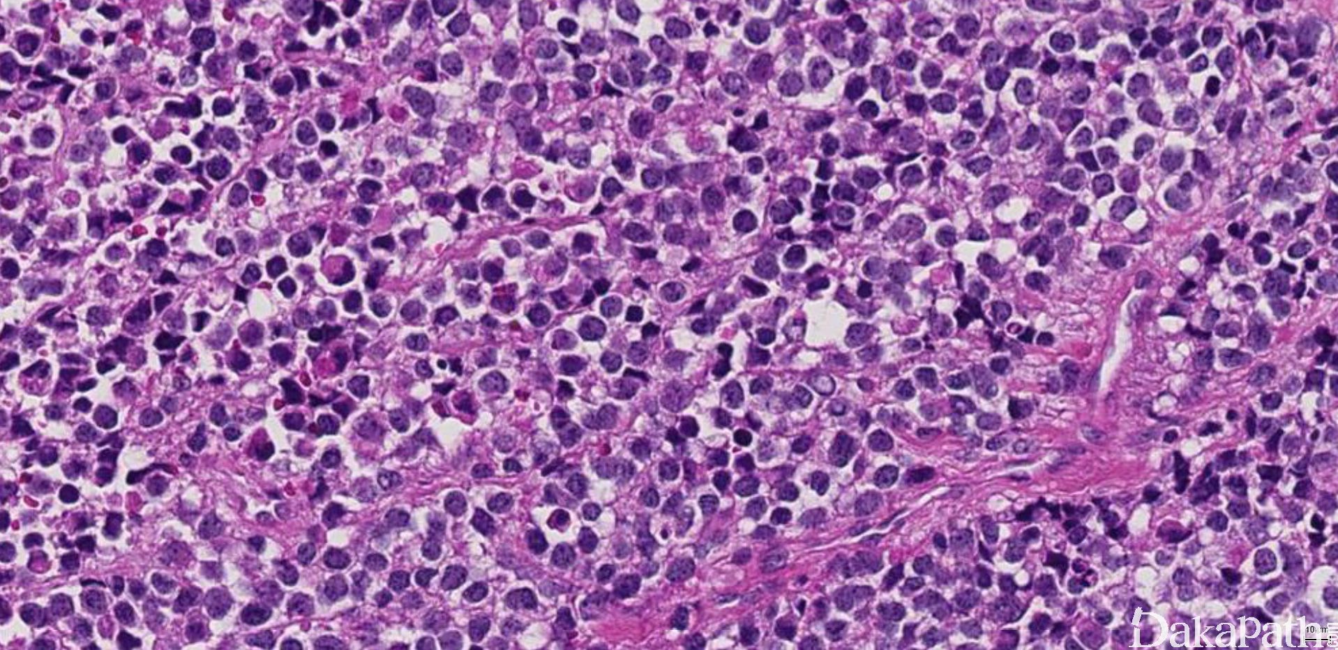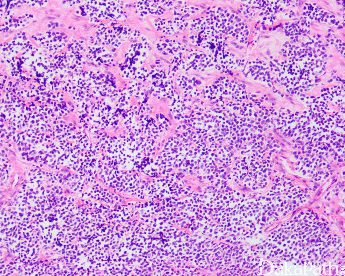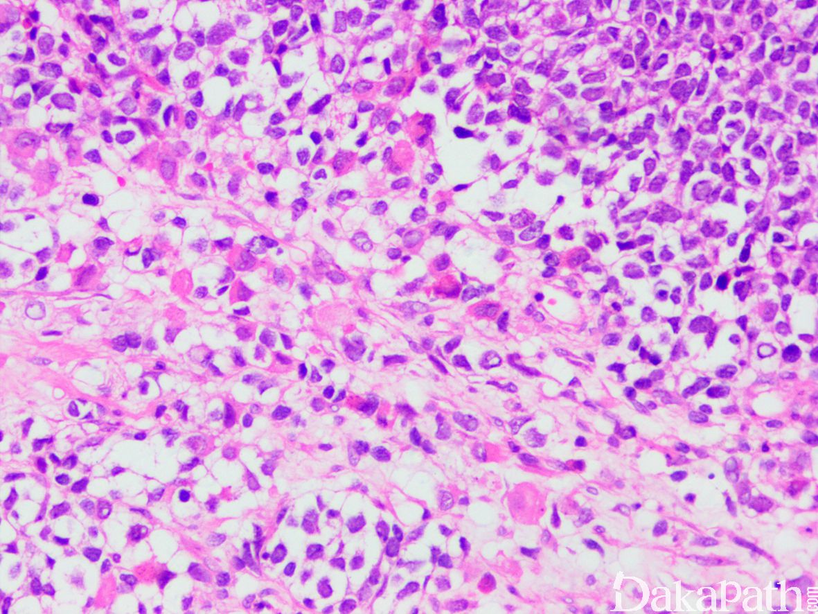 10. 由实性的瘤细胞巢组成,瘤细胞圆而较一致,具有纤细的空泡状染色质和小的核仁,部分病例瘤细胞胞质丰富而淡染或透明,类似肾透明细胞癌或软组织透明细胞肉瘤,称透明细胞变型;;