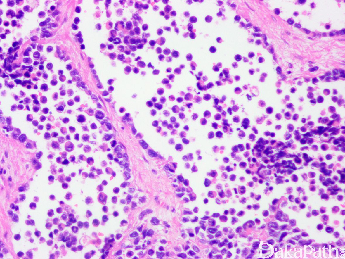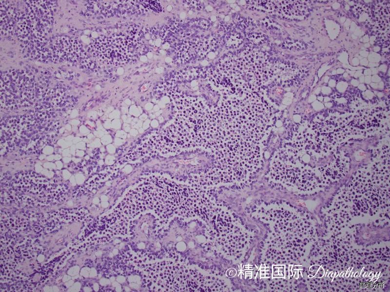 4. 瘤细胞排列成片状和巢状而贴附于纤维性间隔上,巢中央瘤细胞黏附性差,相互解离,形成特征性的假腺泡状或微囊状结构;