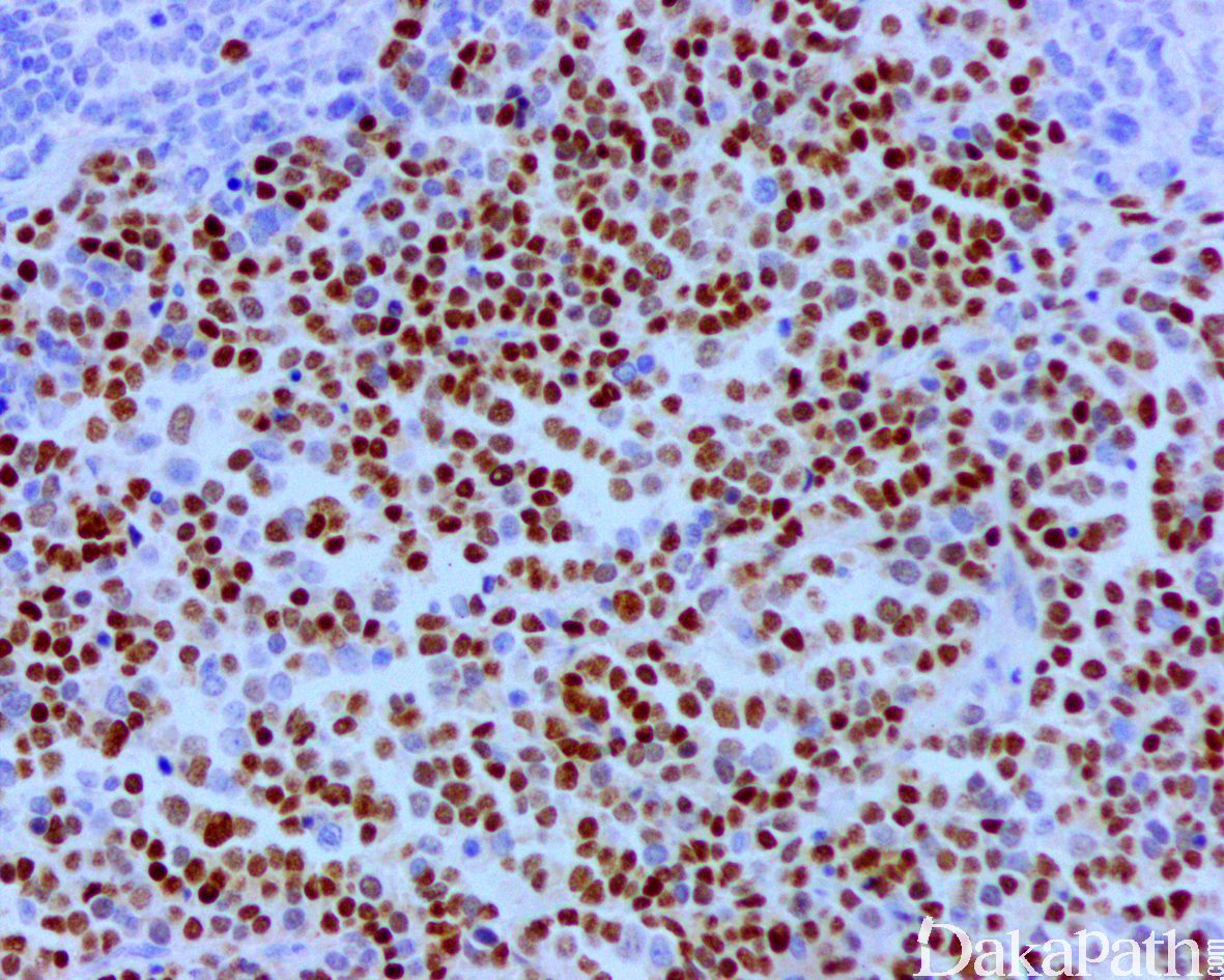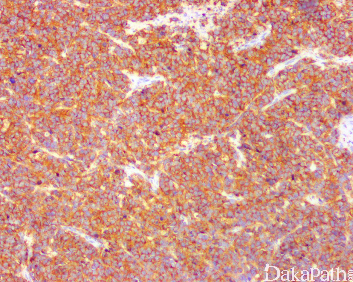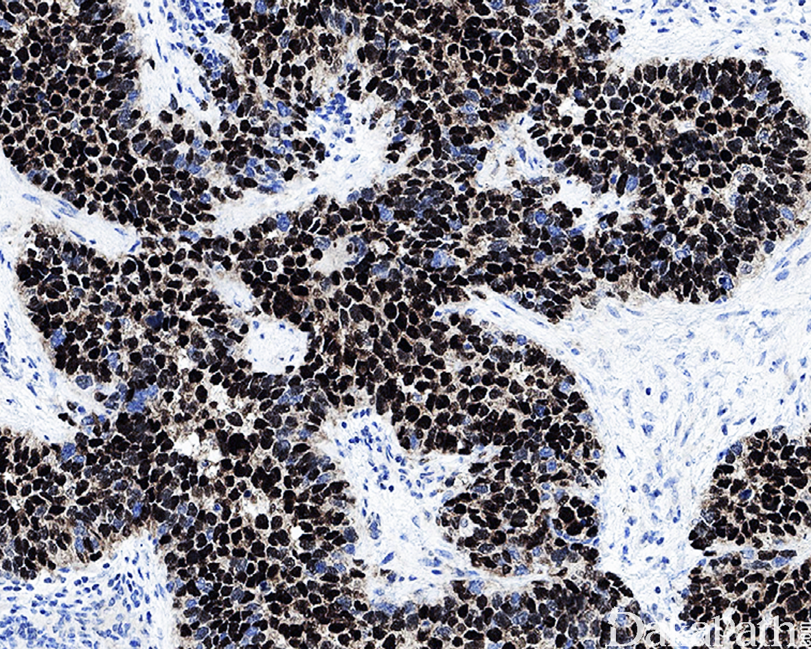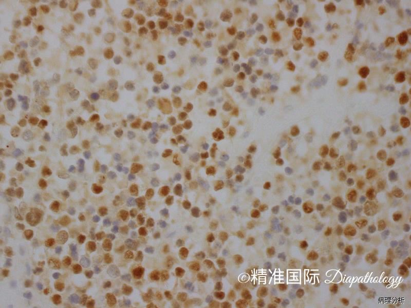 desmin、MSA、myogenin 和 MyoD1 常阳性。Myogenin 通常为强而弥漫的阳性。伴有 PAX3/7-FOXO1 基因易位的腺泡状横纹肌肉瘤常表达 OLIG2. 部分病例可表达 CK(尤其是发生于头颈部者)以及神经内分泌标志物(特别是 CD56 和 Syn,通常不表达 CGA)可误诊为神经内分泌癌。