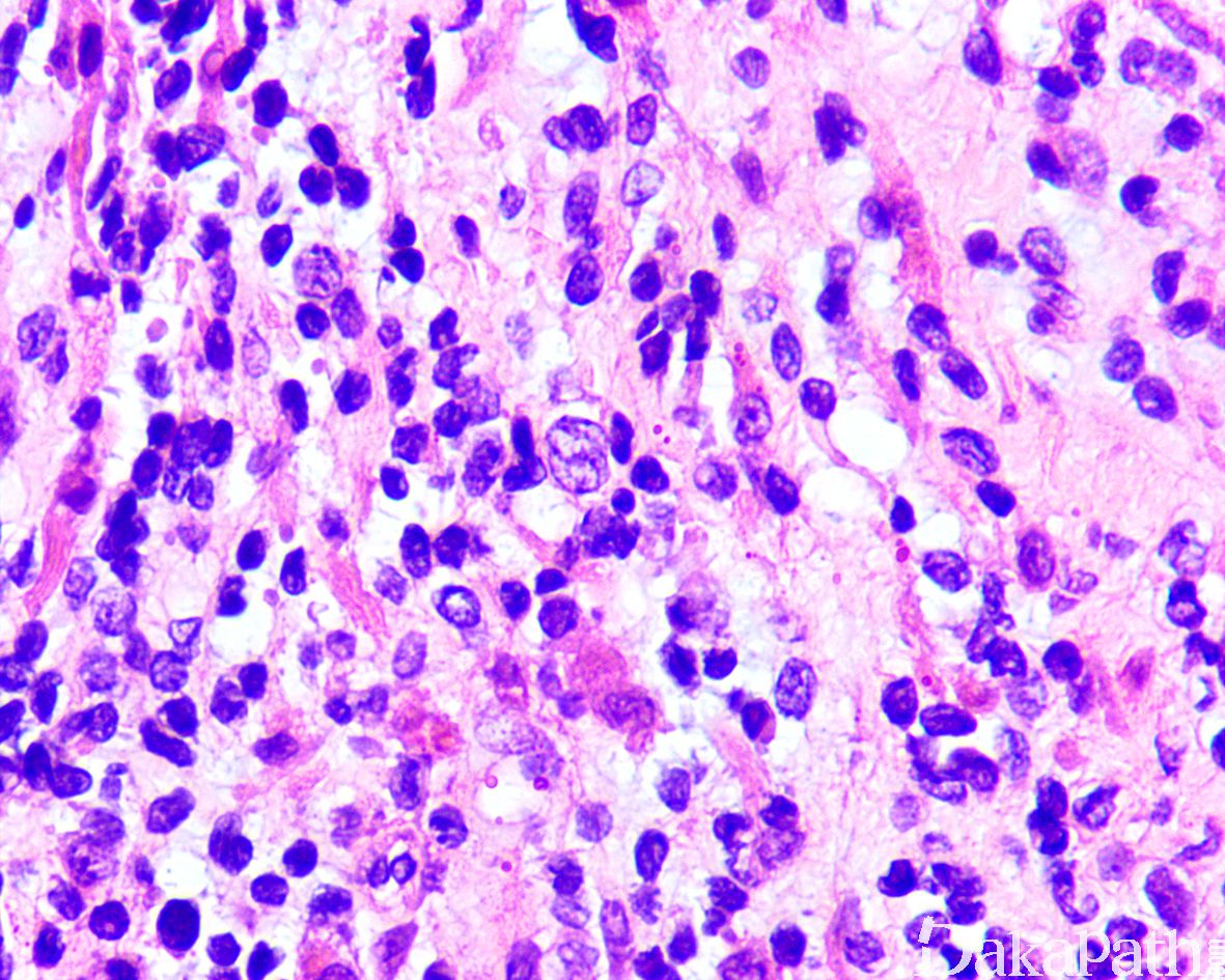 8. 部分病例可见散在的胞质淡染或弱嗜酸性,核位于胞质周边的多核巨细胞;