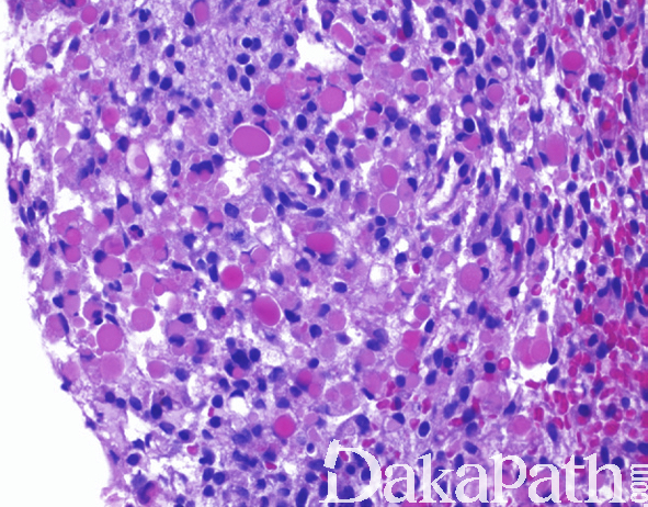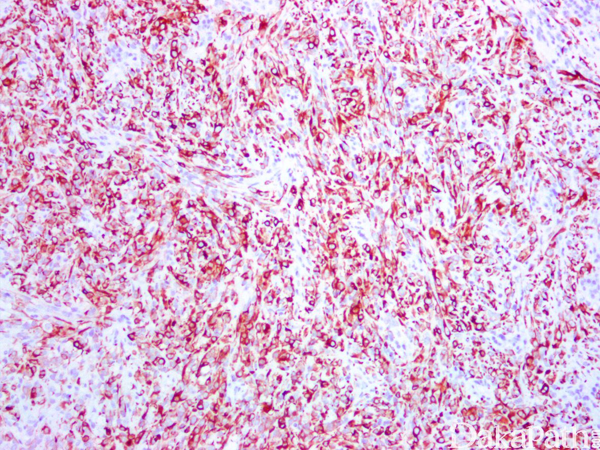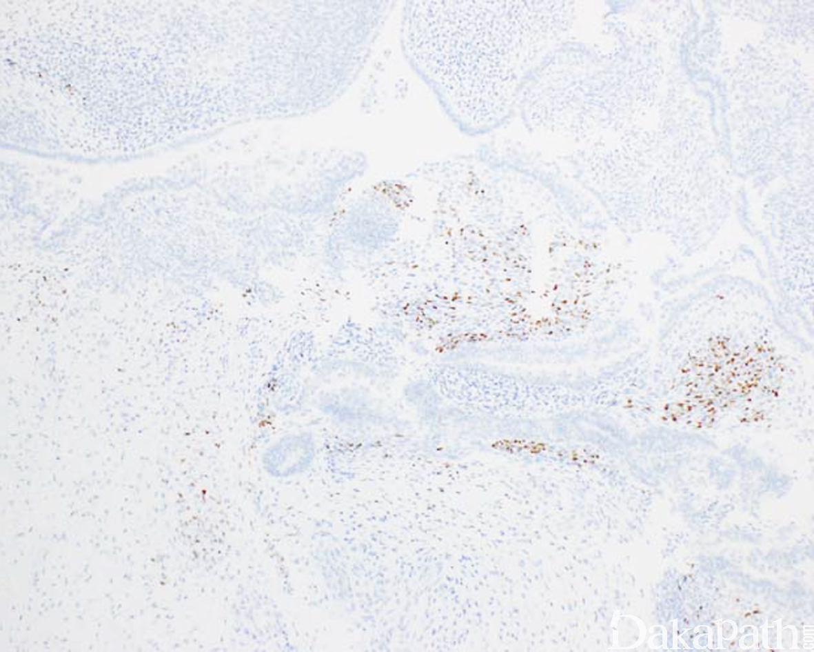 - 当伴有感染时,间质内可见大量的急慢性炎症细胞浸润,有时可掩盖瘤细胞,导致漏诊。