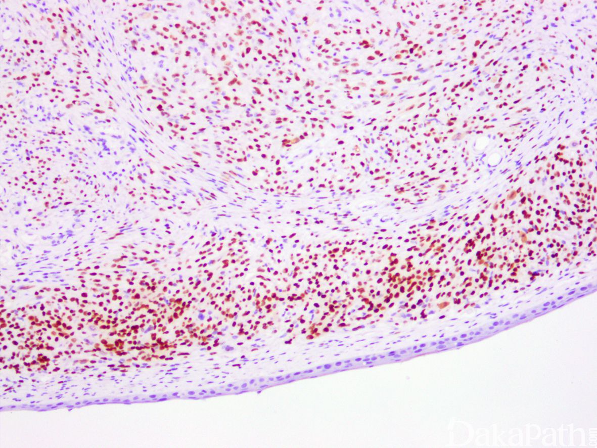 - 器官相关性假肉瘤样肌纤维母细胞增生 :好发于膀胱,患者多为青年人;镜下主要由纤细的梭形纤维母细胞或肌纤维母细胞组成;病变内不见生发层结构,免疫组化标记示梭形细胞常表达 AE 1/AE3,部分表达 actins,偶可表达 ALK1,而 desmin 多为阴性,不表达 myogenin。