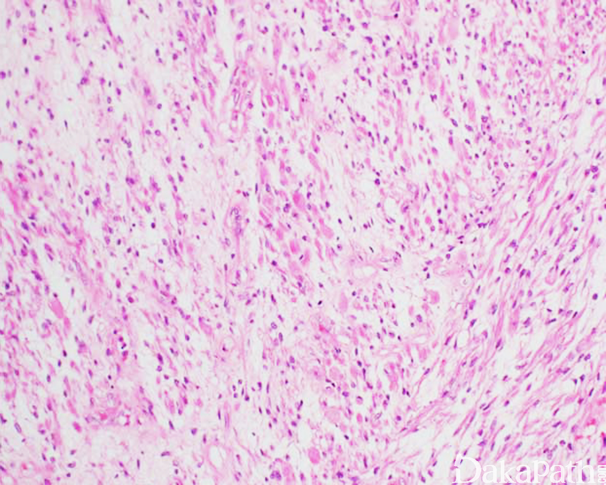 - 形成层以下为黏液样区域,间质疏松、黏液水肿样,内有散在的分化程度不一的梭形、卵圆形或圆形横纹肌母细胞,可见核分裂像;