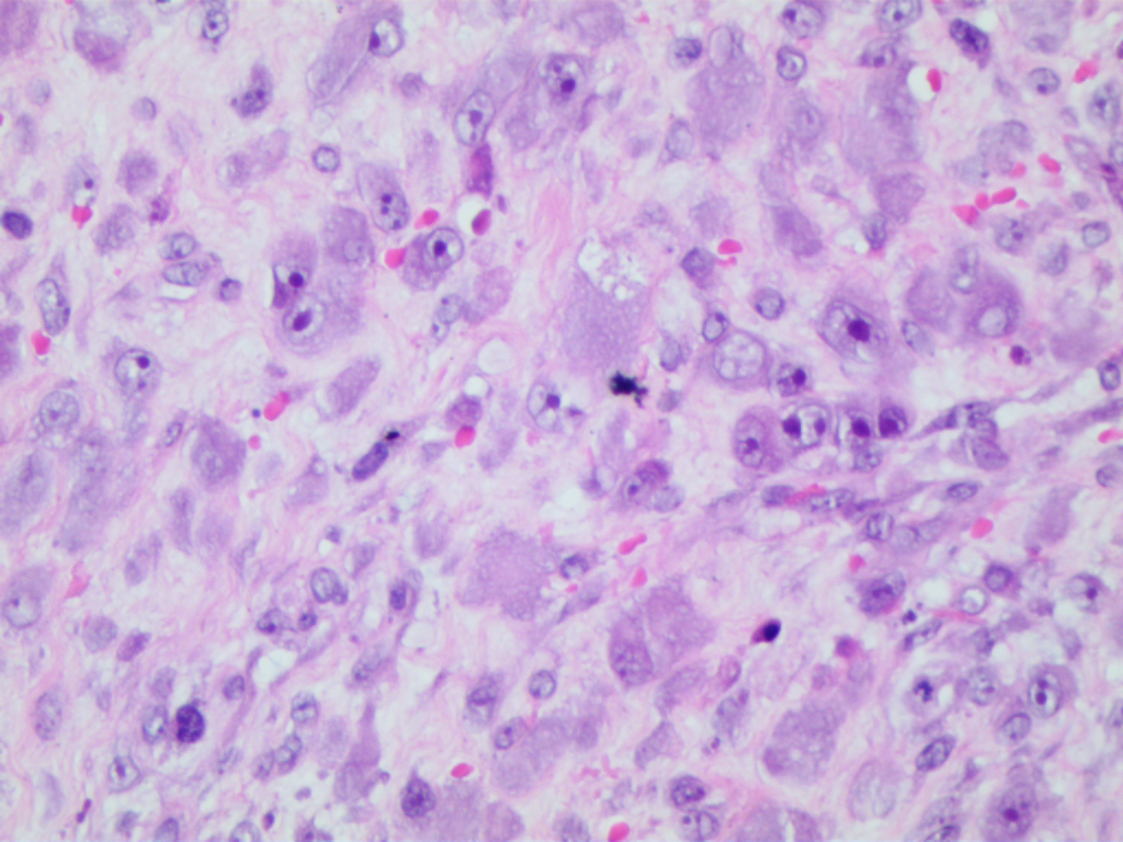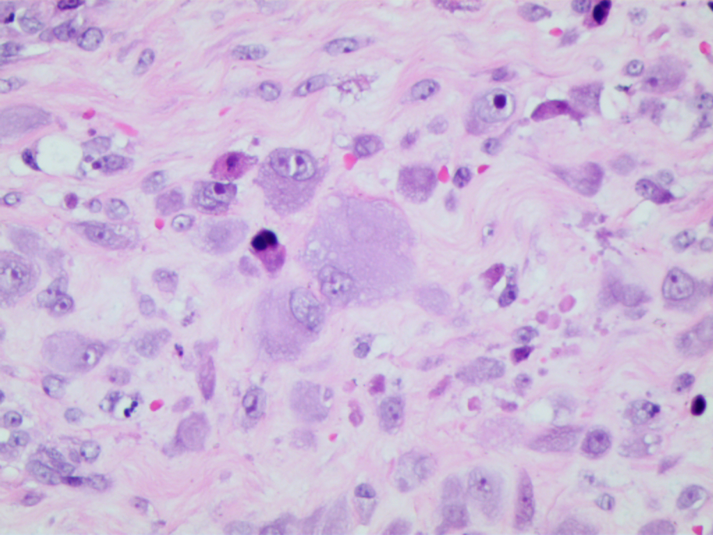 横纹肌肉瘤:可见非典型核分裂象,免疫组化染色表达 desmin 和 Myod1, myogenin 等。