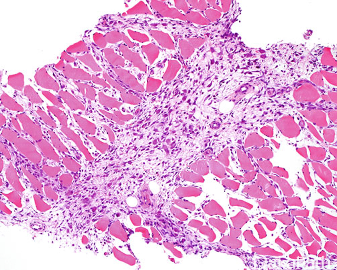 6. 病变穿插于横纹肌纤维之间,在横切面上常形成“棋盘”样,不累及横纹肌纤维本身;