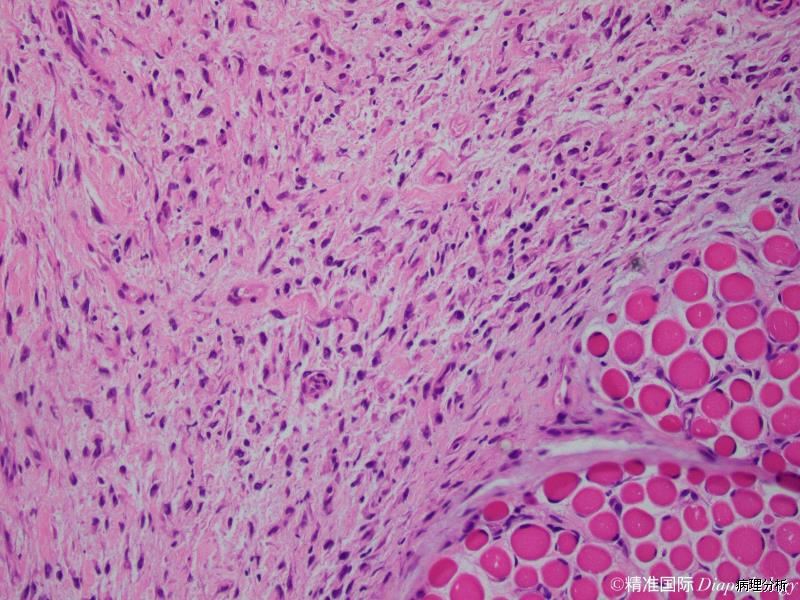 2. 由大量增生的纤维母细胞、肌纤维母细胞、节细胞样细胞和形态上介于两者之间的过渡形细胞组成;