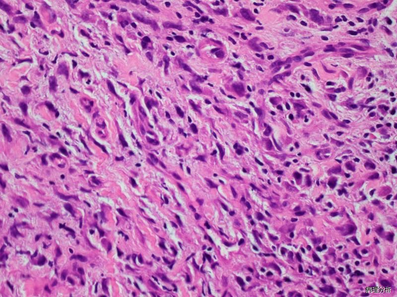 3. 纤维母细胞、肌纤维母细胞呈梭形或胖梭形,也可呈蝌蚪状和不规则形,核膜厚,染色质呈空泡状,可见核仁,核分裂像多少不等,但无病理性核分裂;